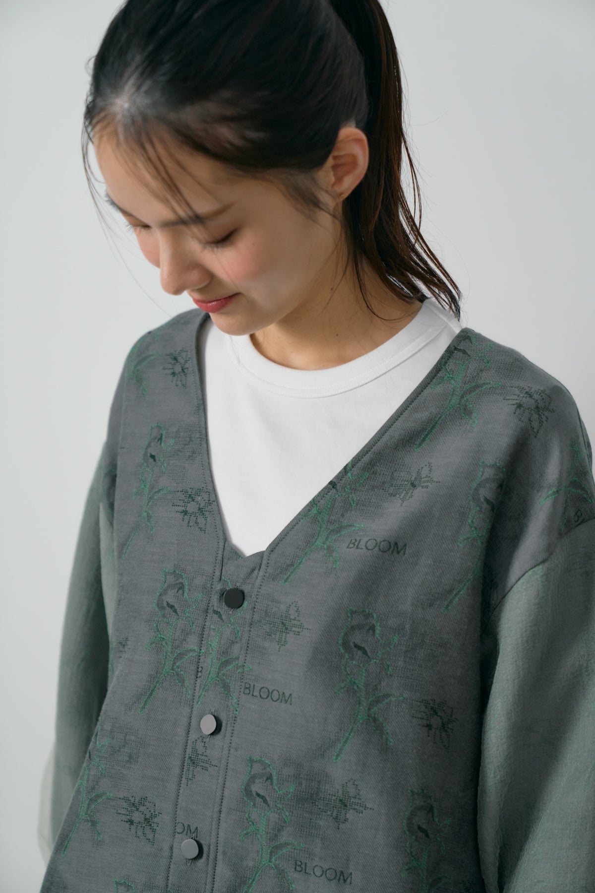 袖のオーガンジー生地がアクセントとなったカーディガン。綿素材100%の花柄ジャガード生地とオーガンジーの異素材MIXアイテム。陰影感のある繊細なデザインを織り技法で表現したジャカード生地は表面と裏面で色の表情が異なるのが特徴となっております。春の軽いアウターとして活躍間違いなしのカーディガンです。