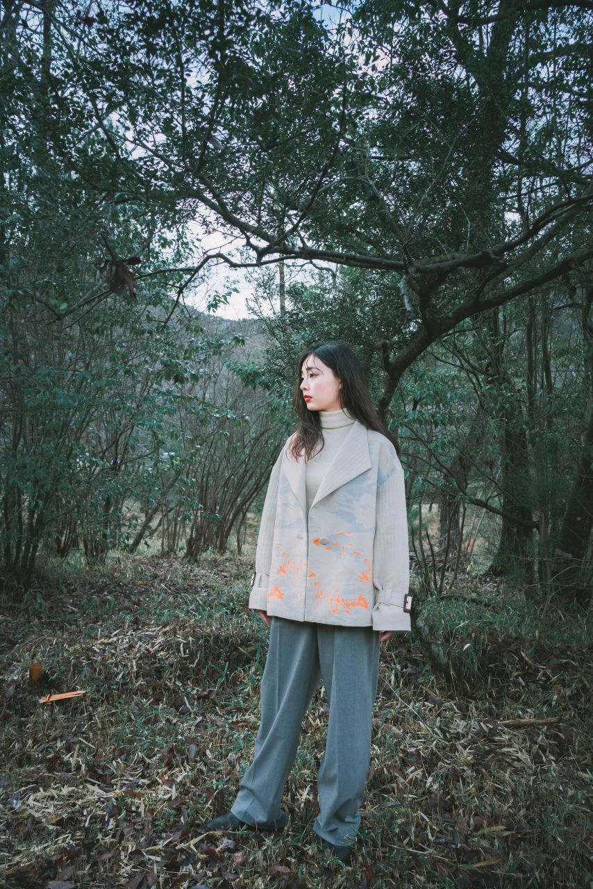 大胆なパネルジャカード生地をあしらったショートコート。