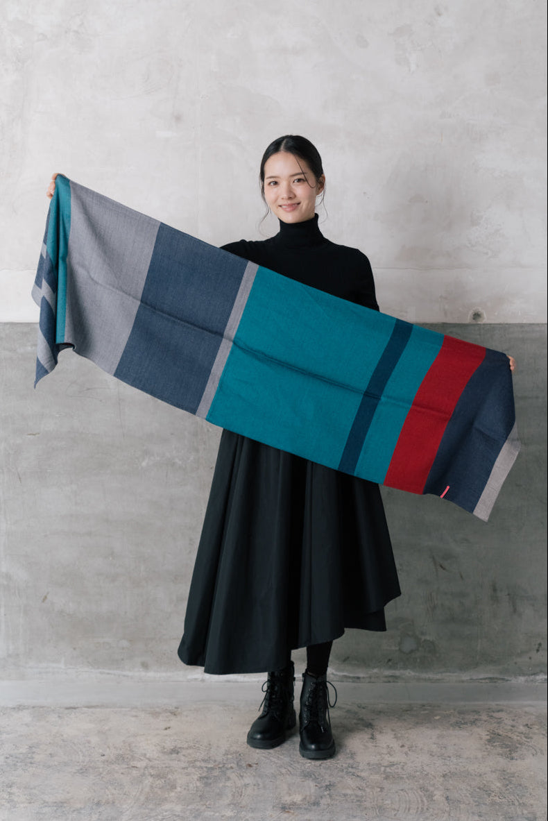 < TEXTILE > 過去から未来へ時空が移動するときの音のリズムを図案にしたデザイン“Rhythm”(リズム)。ランダムな幾何学の動きを2重織ジャカードでリバーシブル表現しました。 表裏の色合いや柄のミックス感を考えながら巻き方を楽しめる羽織ストールです。片面のデザインは濃色で千鳥を変形させた幾何学が歪んでいく動きを表現し、もう一方の面では明るい色調のボーダーでリズムの変化を表現しています。