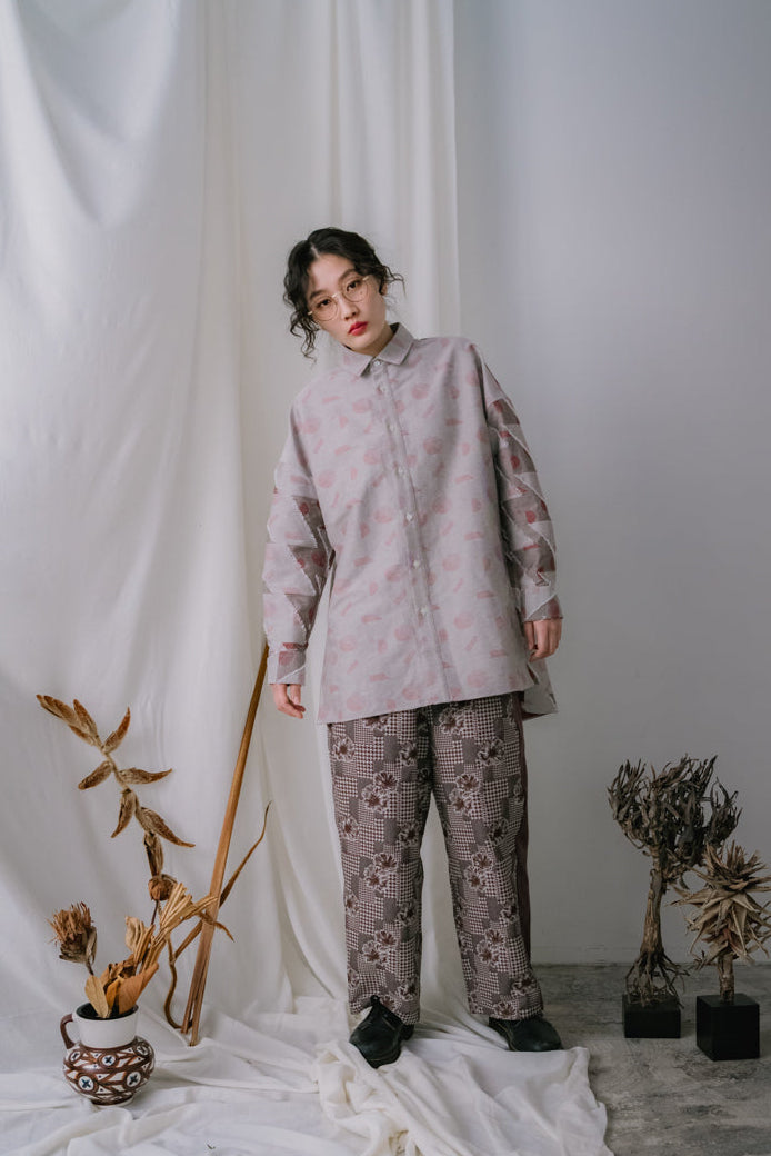 奥行のあるカットジャカードデザインシャツ。背中と袖に2種類のデザインが合わさったカットジャカード生地を使用しました。綿素材100%で出来ているため家庭でも扱いやすいアイテムとなっております。着丈が長めで裾を直線に仕上げたことによりボタンを開けて襟元に抜け感を持たせたり、羽織として着用したりとコーデをアレンジしやすいデザインに仕上げました。