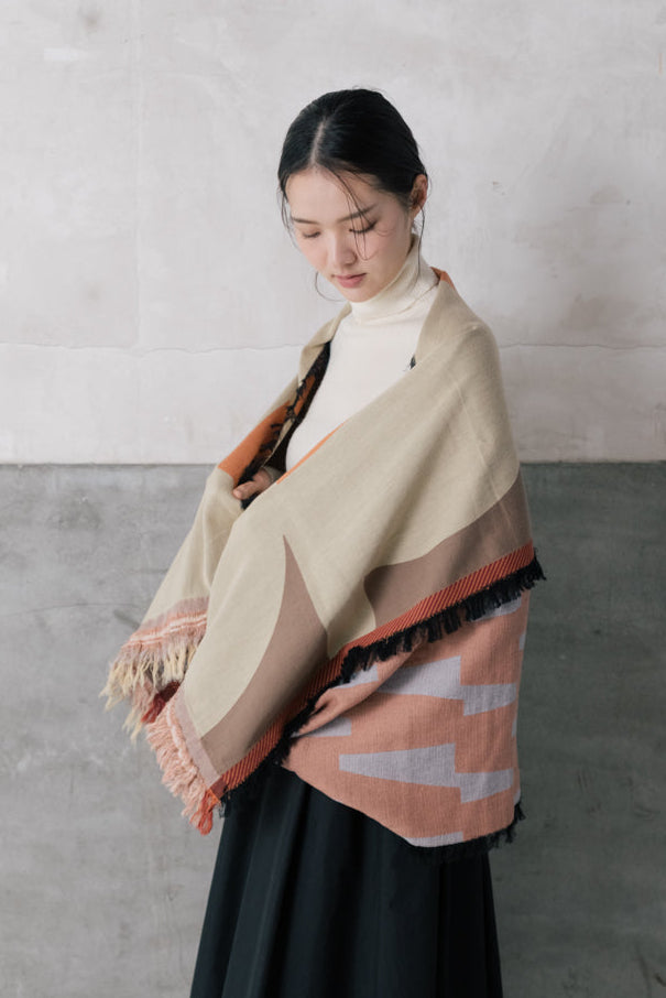 < TEXTILE > 過去から未来へ時空が移動するときの音のリズムを図案にしたデザイン“Rhythm”(リズム)。ランダムな幾何学の動きを2重織ジャカードでリバーシブル表現しました。 表裏の色合いや柄のミックス感を考えながら巻き方を楽しめる羽織ストールです。片面のデザインは濃色で千鳥を変形させた幾何学が歪んでいく動きを表現し、もう一方の面では明るい色調のボーダーでリズムの変化を表現しています。