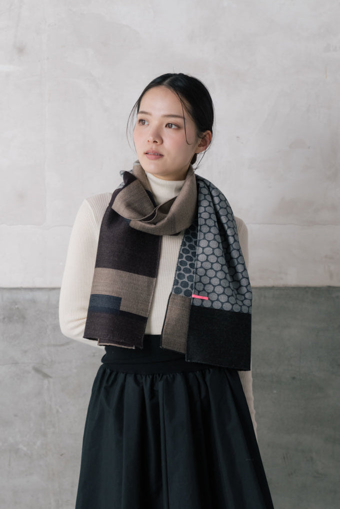 先染めのタテ糸とヨコ糸から生まれる色の重なりは「織色」といわれる、趣深い色合いに。 ウールを使用した色彩豊かなストールです。
