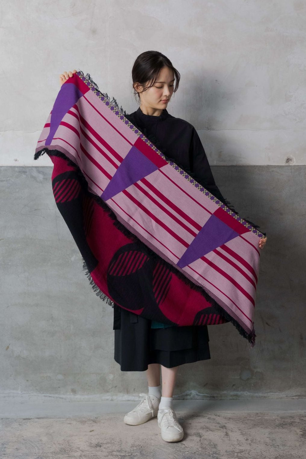 多重レイヤージャカード織の技法を使ったモヒカンストール。カット箇所を片端にだけにすることによって、袋の様な特徴的な形を持ったストールになっております。 フリンジがアクセントになり巻き方によって色合いや柄の組み合わせが楽しめます。