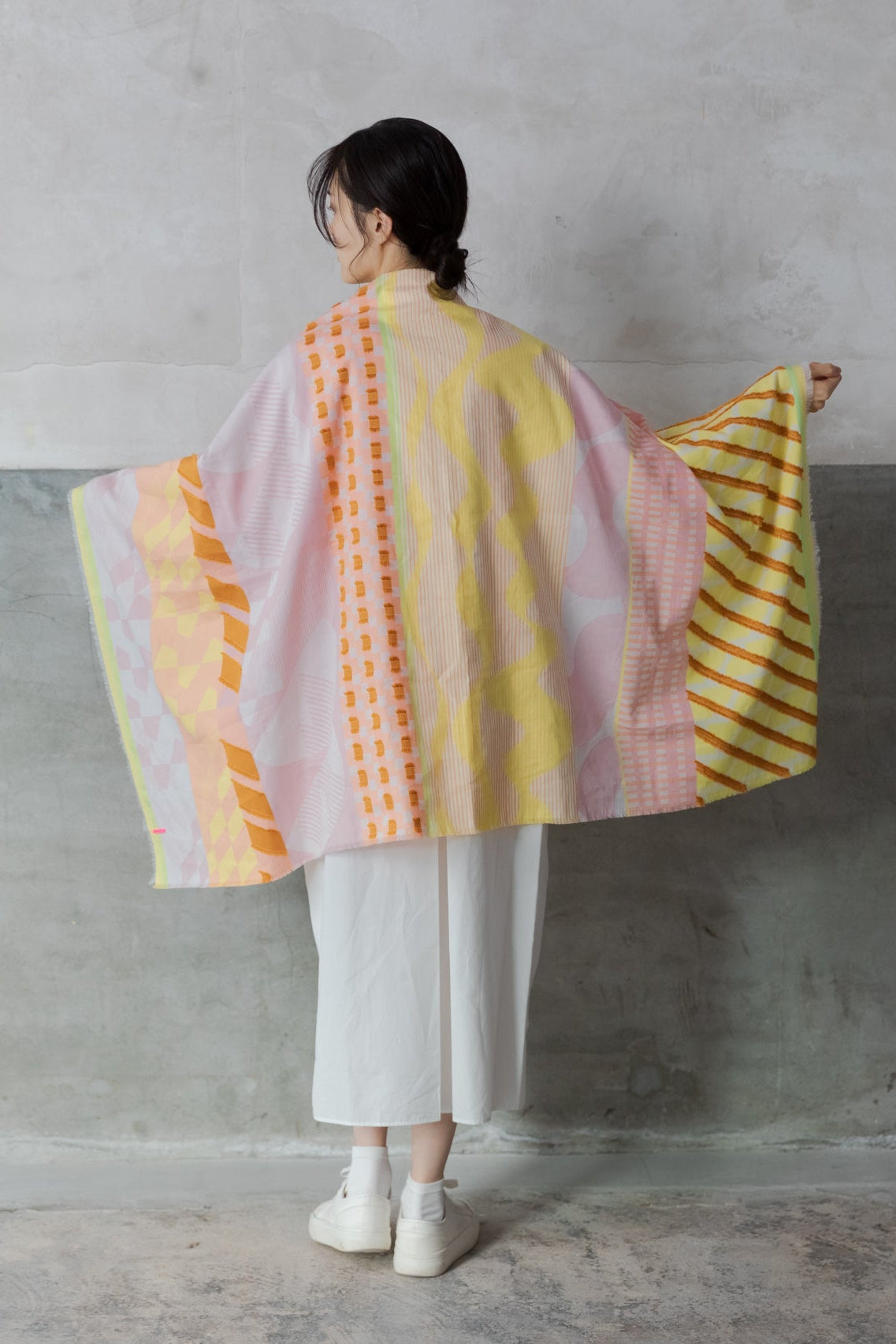 多重レイヤージャカード織の技法を使ったモヒカンストール。カット箇所を片端にだけにすることによって、袋の様な特徴的な形を持ったストールになっております。 フリンジがアクセントになり巻き方によって色合いや柄の組み合わせが楽しめます。