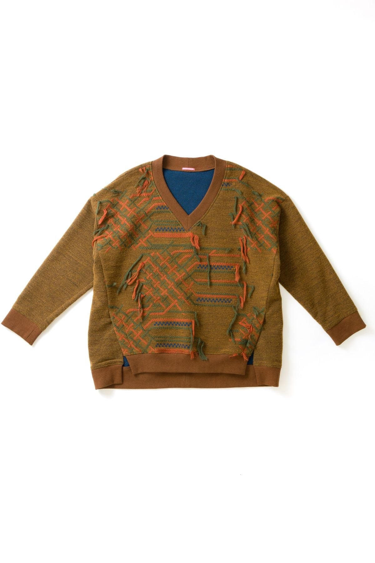 < TEXTILE > 手でゆっくり編まれたカゴのようなクラフト感をジャガード織で表現しました。あえて線の間隔が不揃いだったり揺らいだりしているところを残して柄を制作しています。また、糸の撚りの間に空気を含みやすく軽くて温かい糸、日本にしかない技術で作られたブークレヤーン糸を使用いたしました。 柔らかなウールの風合いが相まって、着用するとゆったりとした気持ちになれそうなテキスタイルです。