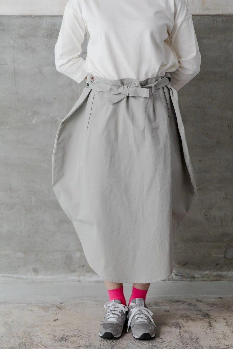 ハリ感のある綿素材の生地を使用したアシンメトリーデザインのスカートです。ウエスト部分が縦長のリブ仕様になっておりますので、着物帯の様に半分に折ってみたり、コルセットの様に折らずにはいてみたり自由にご着用いただけます。立体感のあるシルエットのスカートで裾の長さがランダムになっており、前後が関係ないデザインなのでお好みの向きでご着用いただけます。