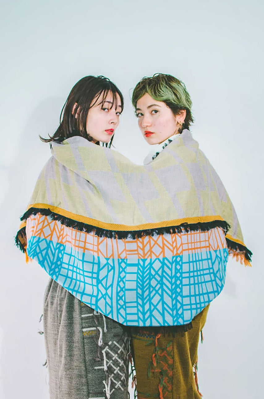 カット箇所を片端にだけにすることによって、袋の様な特徴的な形を持ったストールになっております。 フリンジがアクセントになり巻き方によって色合いや柄の組み合わせが楽しめます。