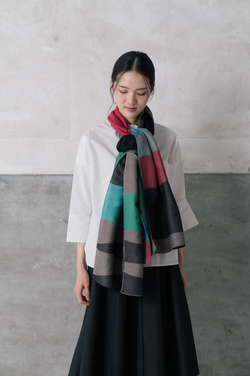 織物メーカーならではの遊び心から生まれたストール。 それぞれ、色合いやデザインが異なるため何通りもの見せ方ができるストールになります。