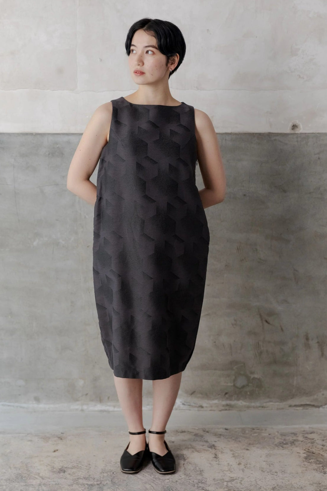 幾何学模様とグラデーションが合わさったデザインをジャカード織機で織り上げシンプルな形のワンピースに仕上げました。