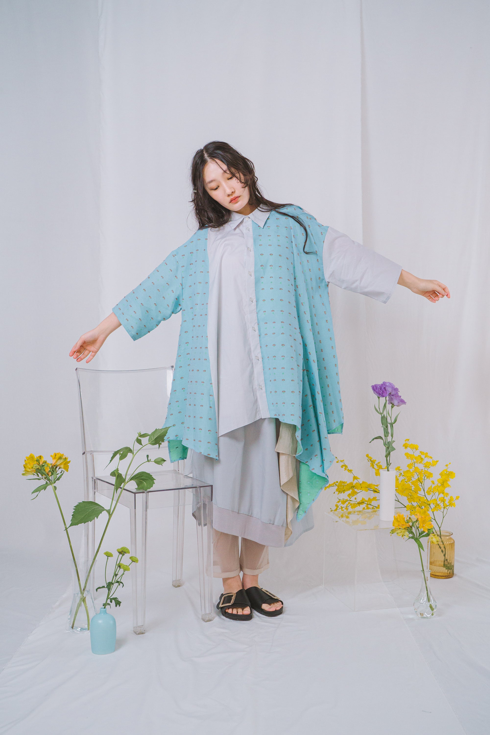 海の生き物、クリオネの様なドルマンデザインのワンピース。ポリエステル混のハリ感のある生地とリブ素材を組み合わせました。ギャザーデザインをほどこしゆとりのある着心地とスマートさを兼ね備えた形に仕上げました。同素材のPETAL スカートと組み合わせもオススメです。ポケット付き