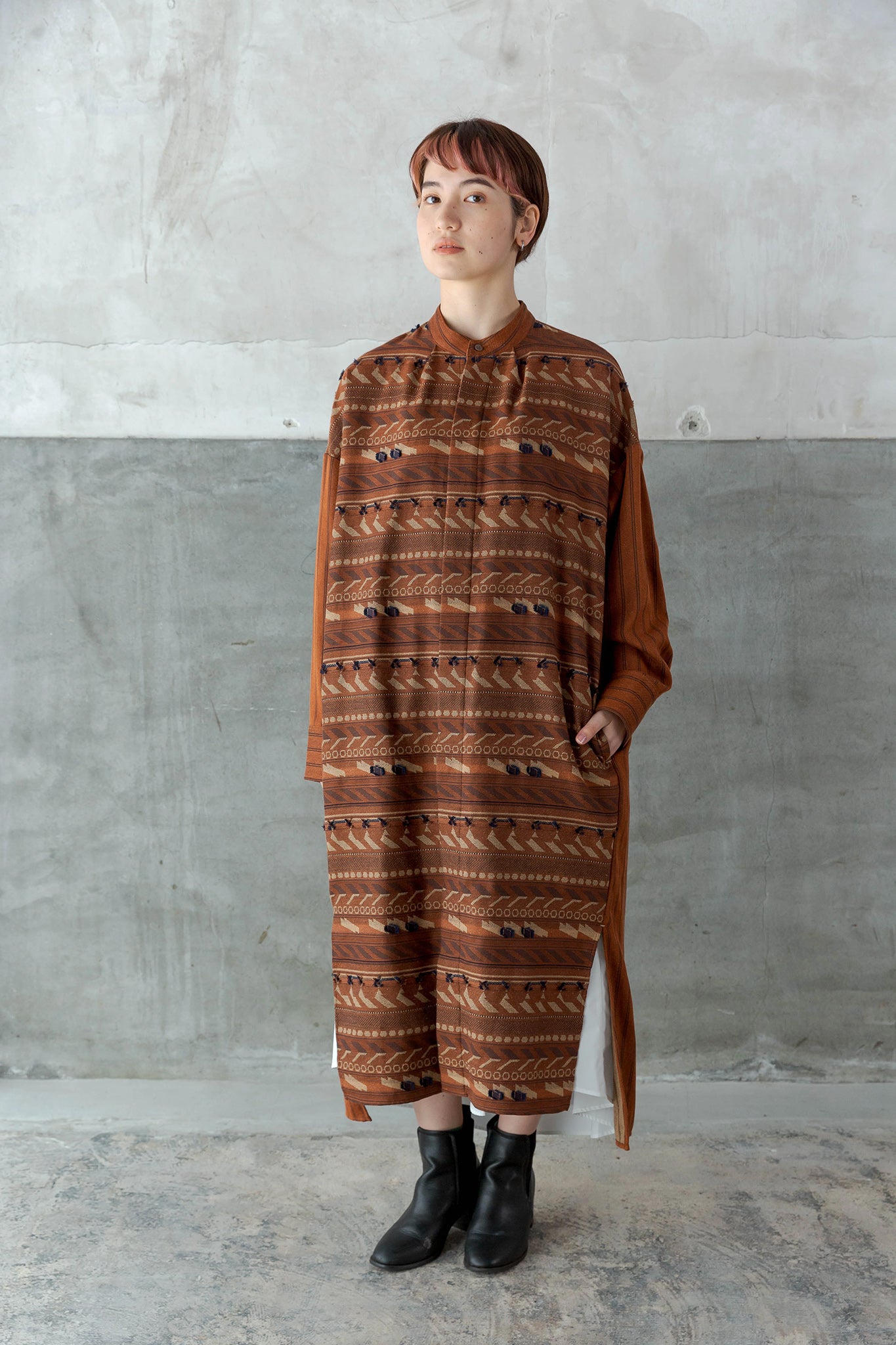 スリット部分やポケット口などにジャカード生地や差し色の無地生地をしているのがポイントです。1枚でワンピースとして、前を開けて軽いアウターとしても着用が可能です。付属のベルトを使用して印象の異なる着こなしを楽しむこともできます。