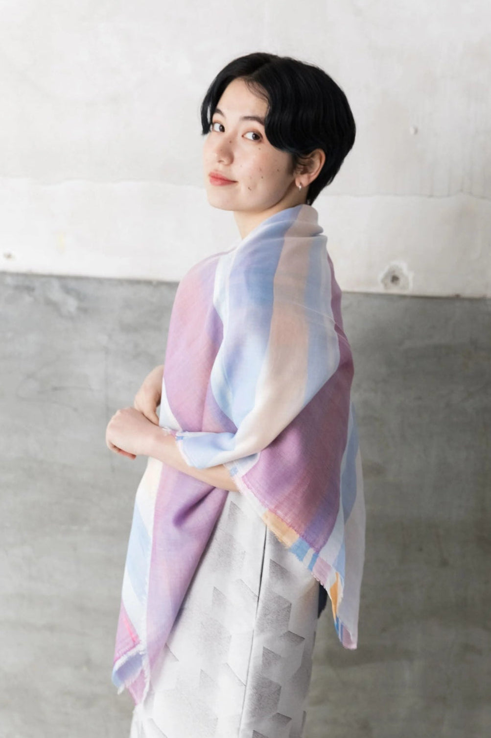 季節をまたいで楽しんでいただけるボーダーストールです。