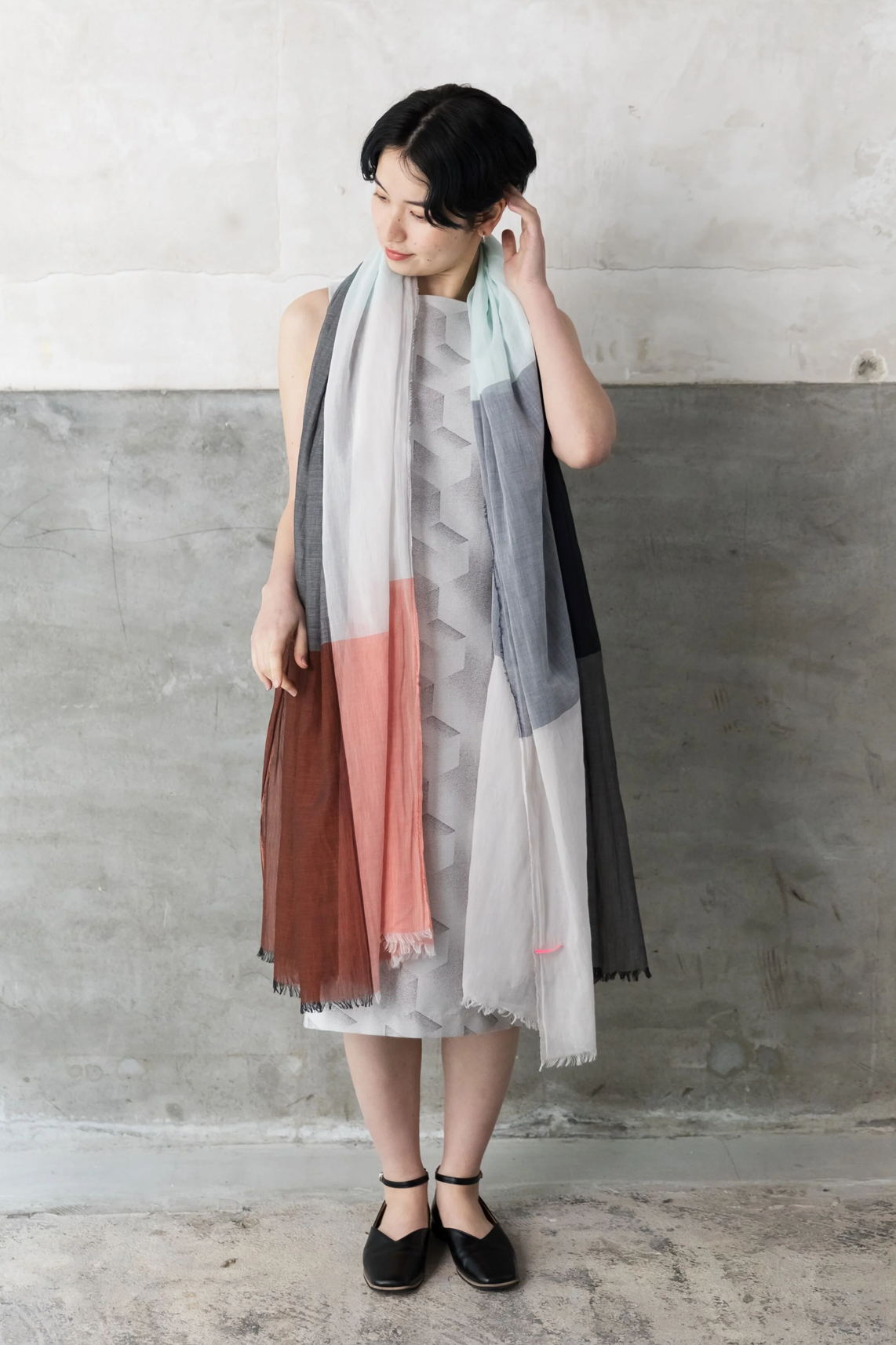 春夏はライトカラーを白いシャツに合わせて。 すこし首元が寒くなる秋にはダークカラーをみせる巻き方を。 季節をまたいで楽しんでいただけるボーダーストールです。