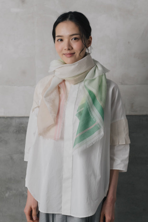 ふわりとした手触りが特徴で、織物の端にあたる耳部分には色糸を用いてアクセントになるデザインに仕上げました。糸と糸の交差による、先染織物ならではの奥深い色合いです。