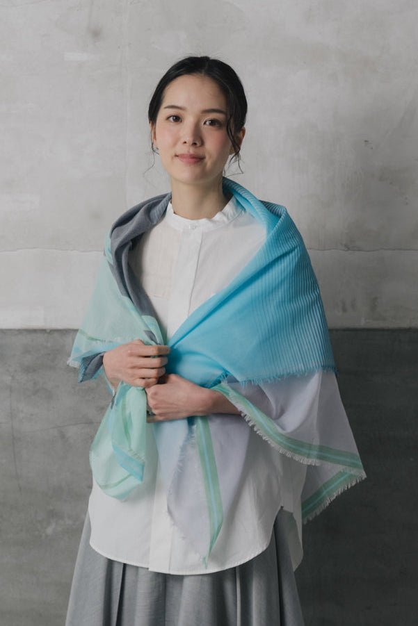 ふわりとした手触りが特徴で、織物の端にあたる耳部分には色糸を用いてアクセントになるデザインに仕上げました。糸と糸の交差による、先染織物ならではの奥深い色合いです。