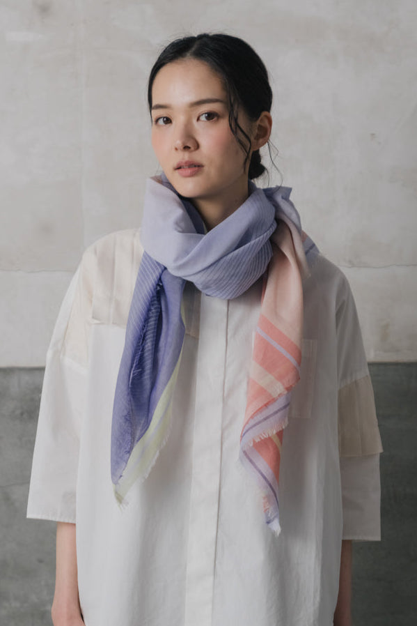 春夏はライトカラーを白いシャツに合わせて。 すこし首元が寒くなる秋にはダークカラーをみせる巻き方を。 季節をまたいで楽しんでいただけるボーダーストールです。