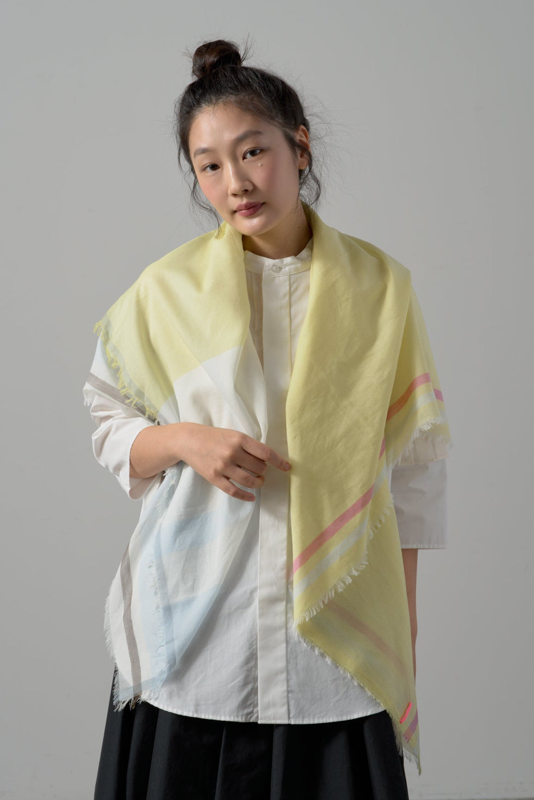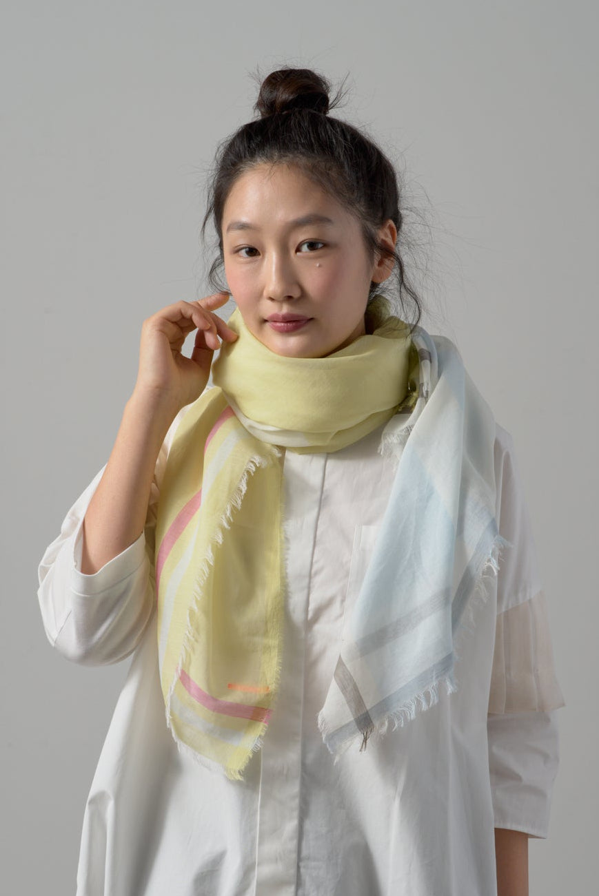 ふわりとした手触りが特徴で、織物の端にあたる耳部分には色糸を用いてアクセントになるデザインに仕上げました。糸と糸の交差による、先染織物ならではの奥深い色合いです。