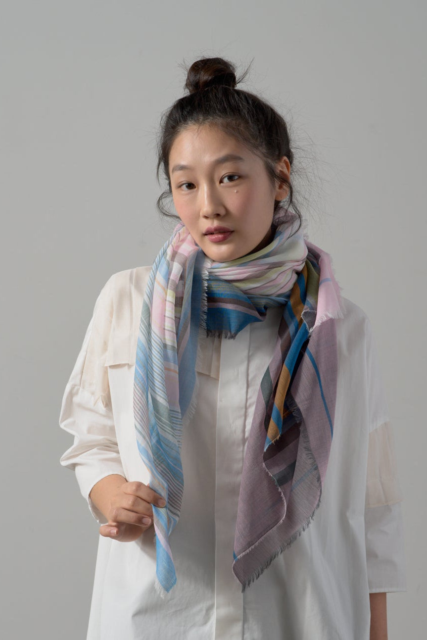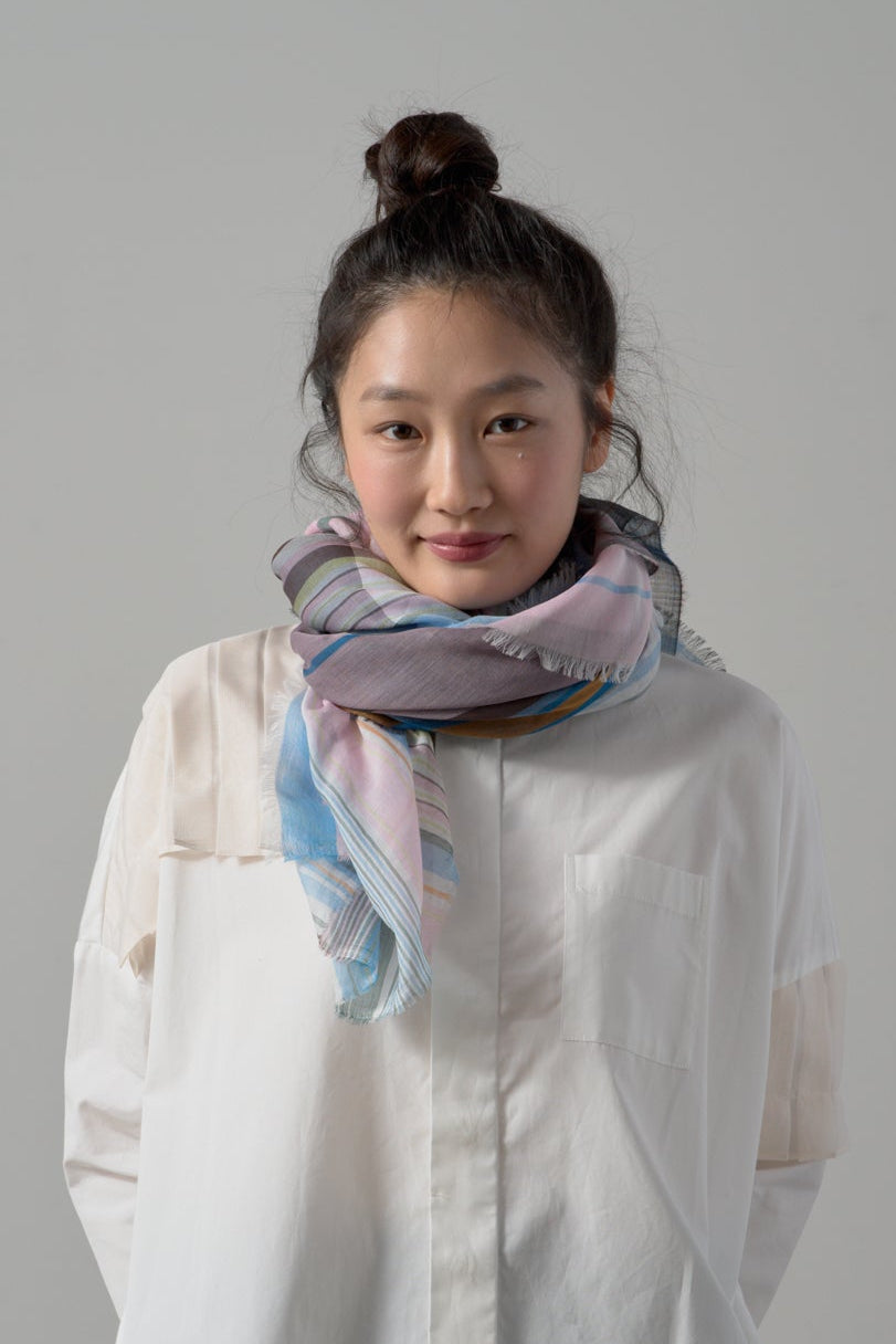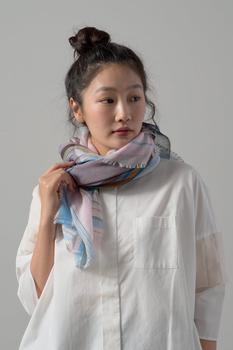 春夏はライトカラーを白いシャツに合わせて。 すこし首元が寒くなる秋にはダークカラーをみせる巻き方を。 季節をまたいで楽しんでいただけるボーダーストールです。