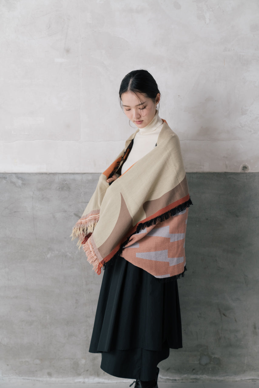 多重レイヤージャカード織の技法を使ったモヒカンストール。カット箇所を片端にだけにすることによって、袋の様な特徴的な形を持ったストールになっております。 フリンジがアクセントになり巻き方によって色合いや柄の組み合わせが楽しめます。