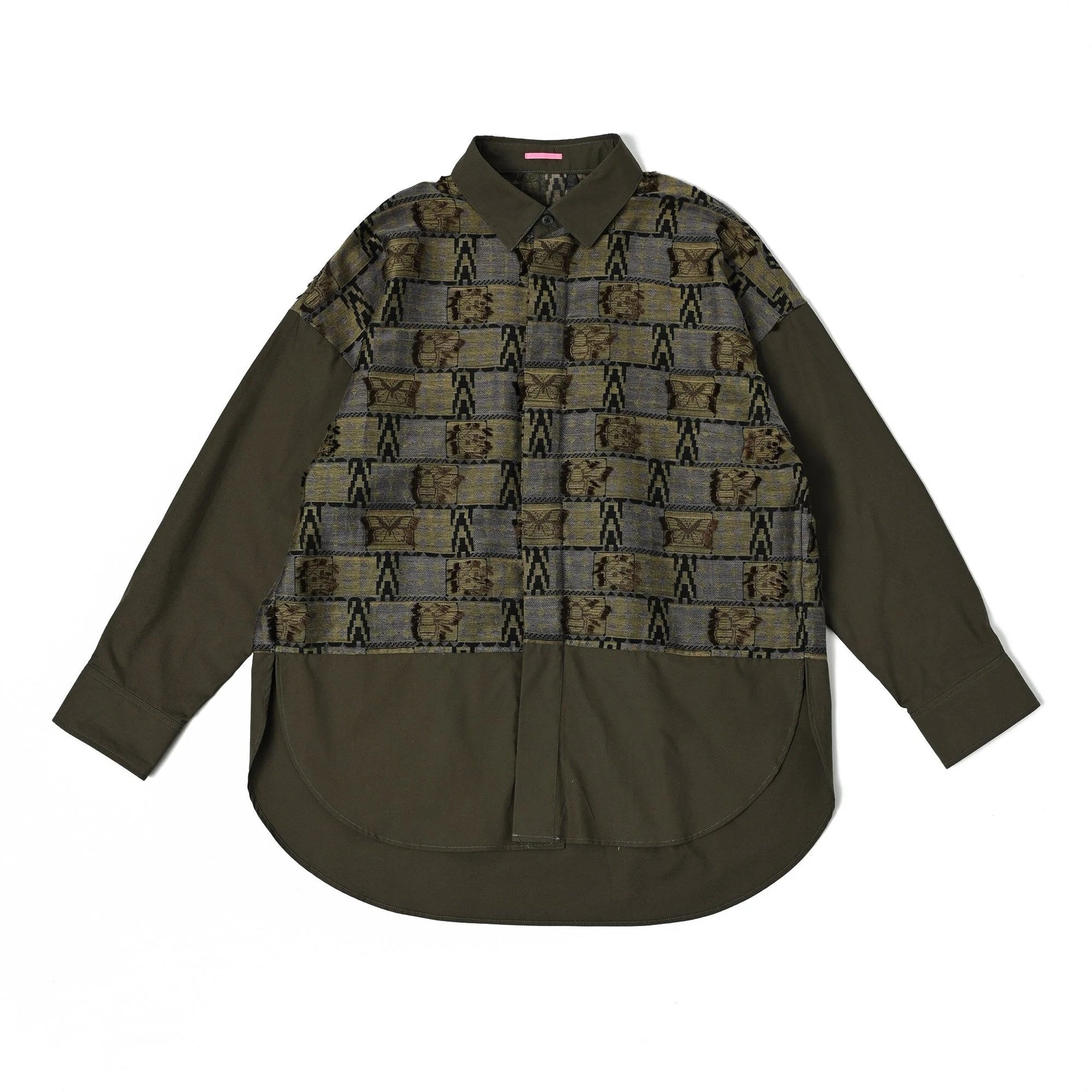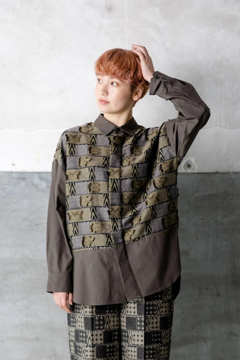 前立てが太くデザインされたスタンドカラーのブラウス。