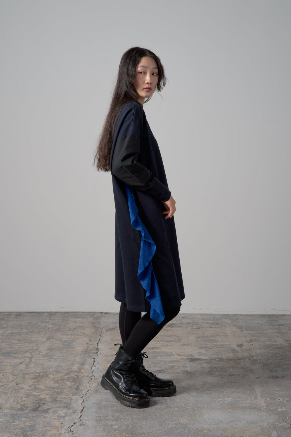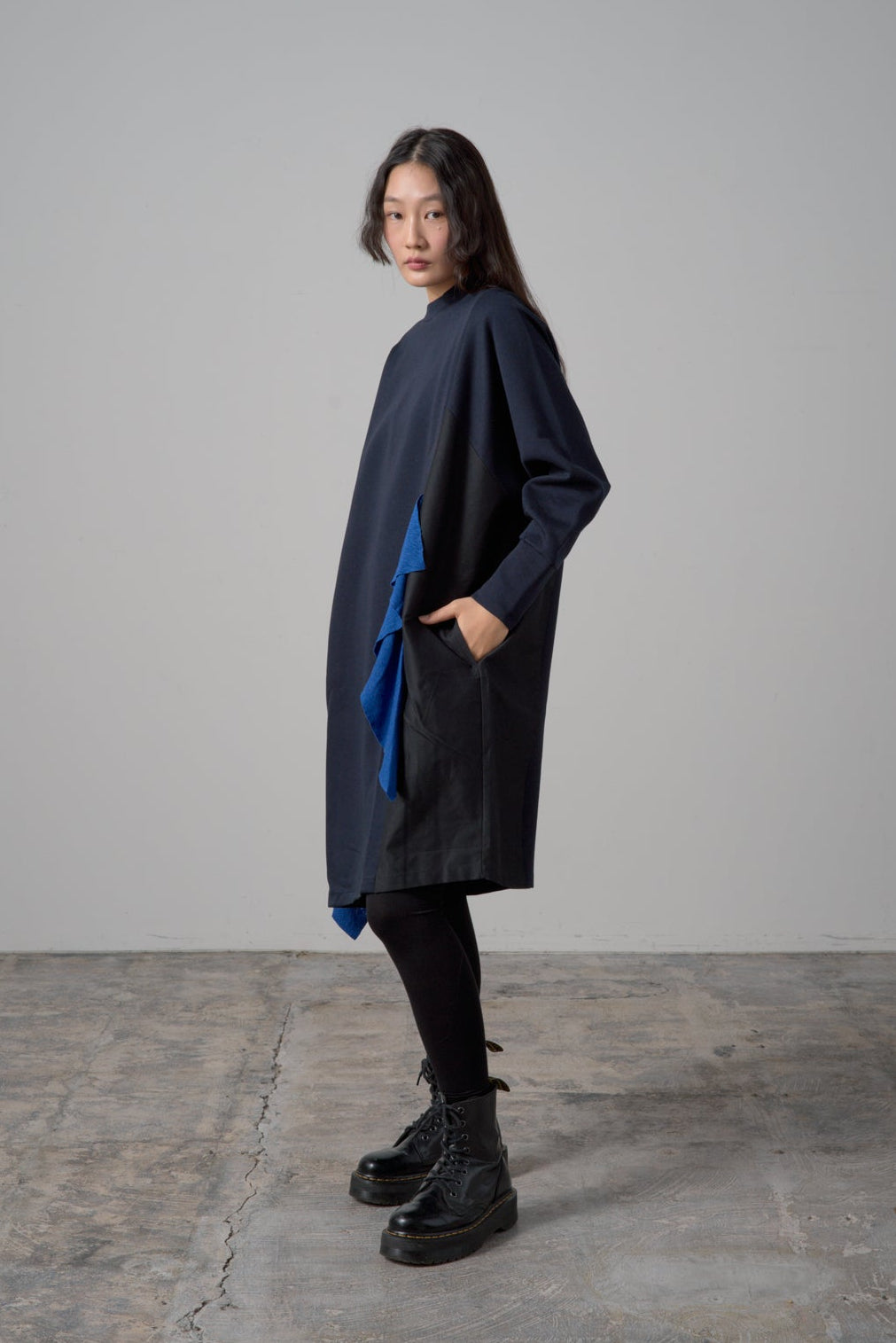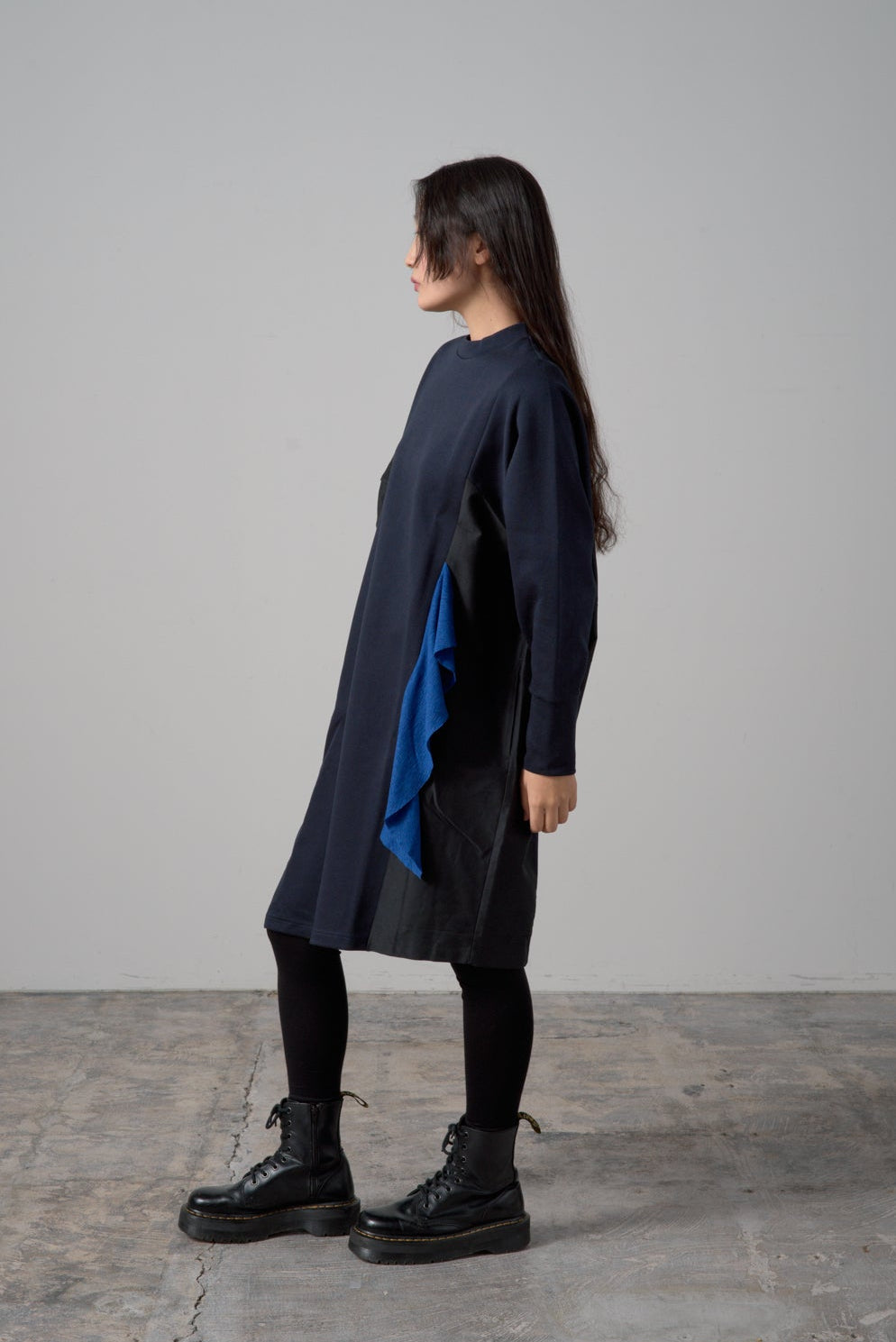 伸縮性の少ないカットソー生地を使用し、カジュアルすぎないワンピースをつくりました。 アシンメトリーデザインや異なる生地の使い合わせで、パターンが光る一枚です。