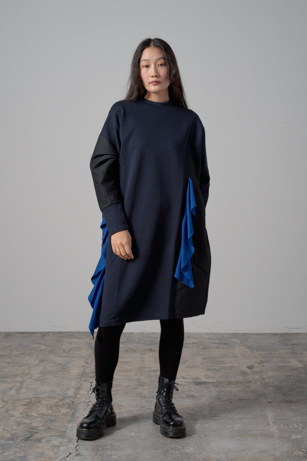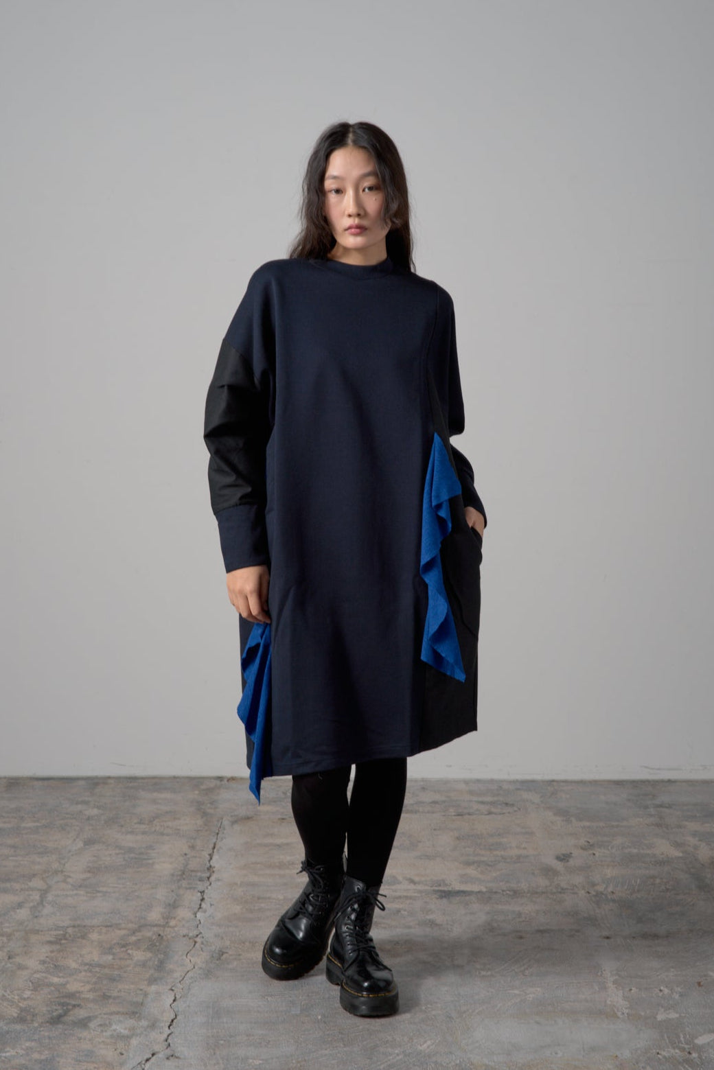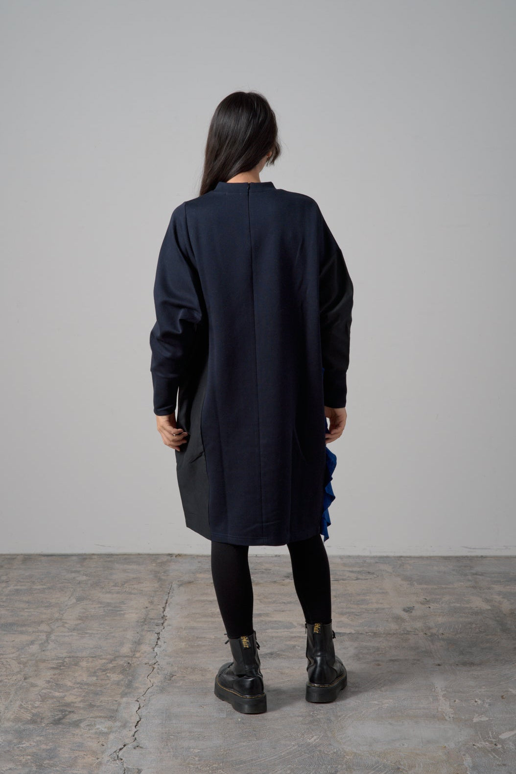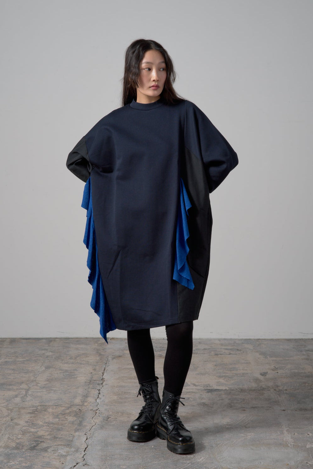 伸縮性の少ないカットソー生地を使用し、カジュアルすぎないワンピースをつくりました。 アシンメトリーデザインや異なる生地の使い合わせで、パターンが光る一枚です。