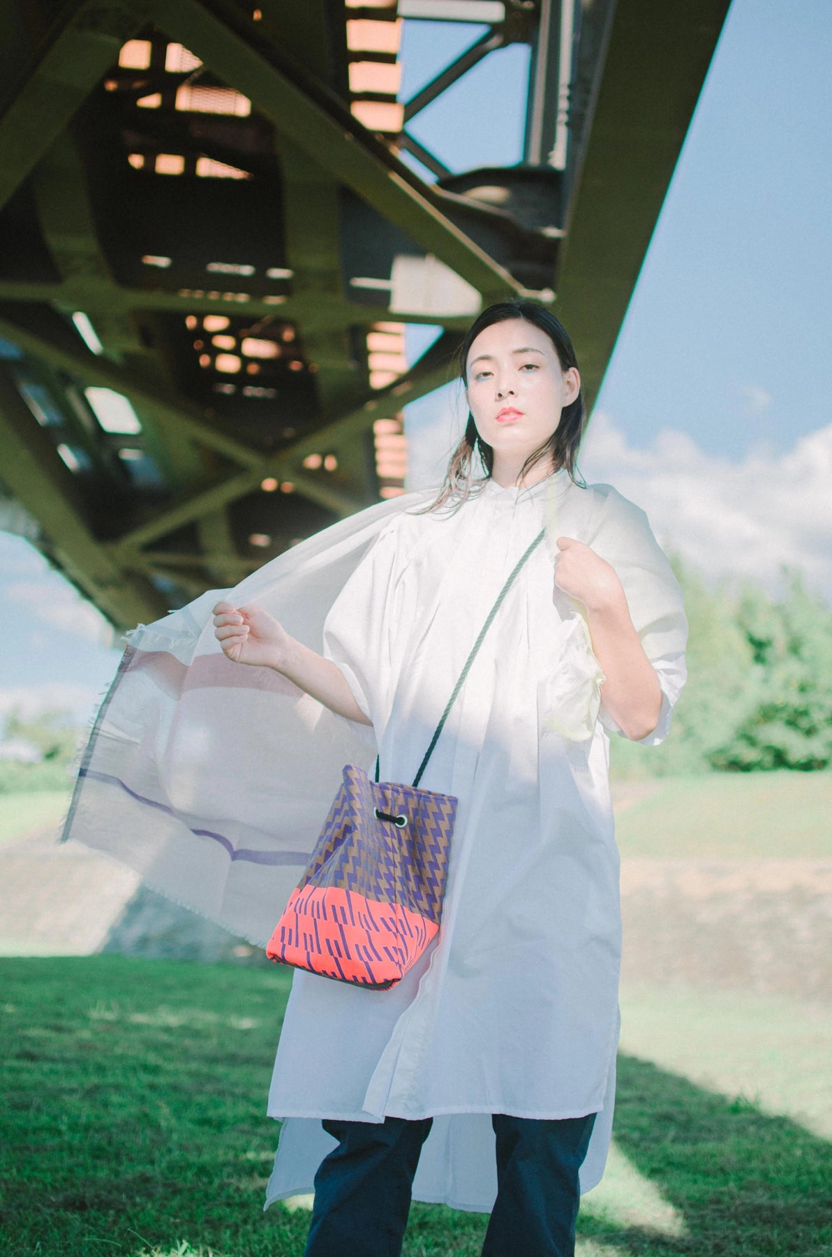 底が三角形の形になっている巾着バッグの様なトライアングルバッグ。