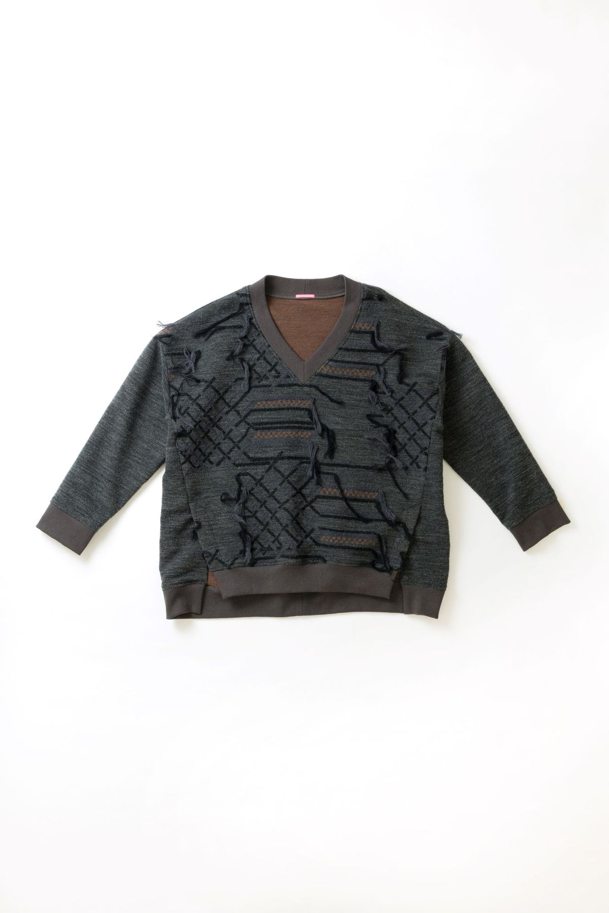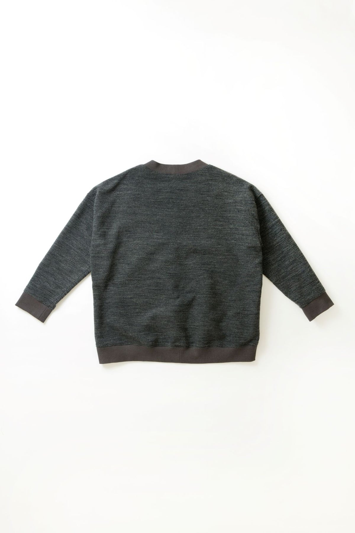< TEXTILE > 手でゆっくり編まれたカゴのようなクラフト感をジャガード織で表現しました。あえて線の間隔が不揃いだったり揺らいだりしているところを残して柄を制作しています。また、糸の撚りの間に空気を含みやすく軽くて温かい糸、日本にしかない技術で作られたブークレヤーン糸を使用いたしました。 柔らかなウールの風合いが相まって、着用するとゆったりとした気持ちになれそうなテキスタイルです。
