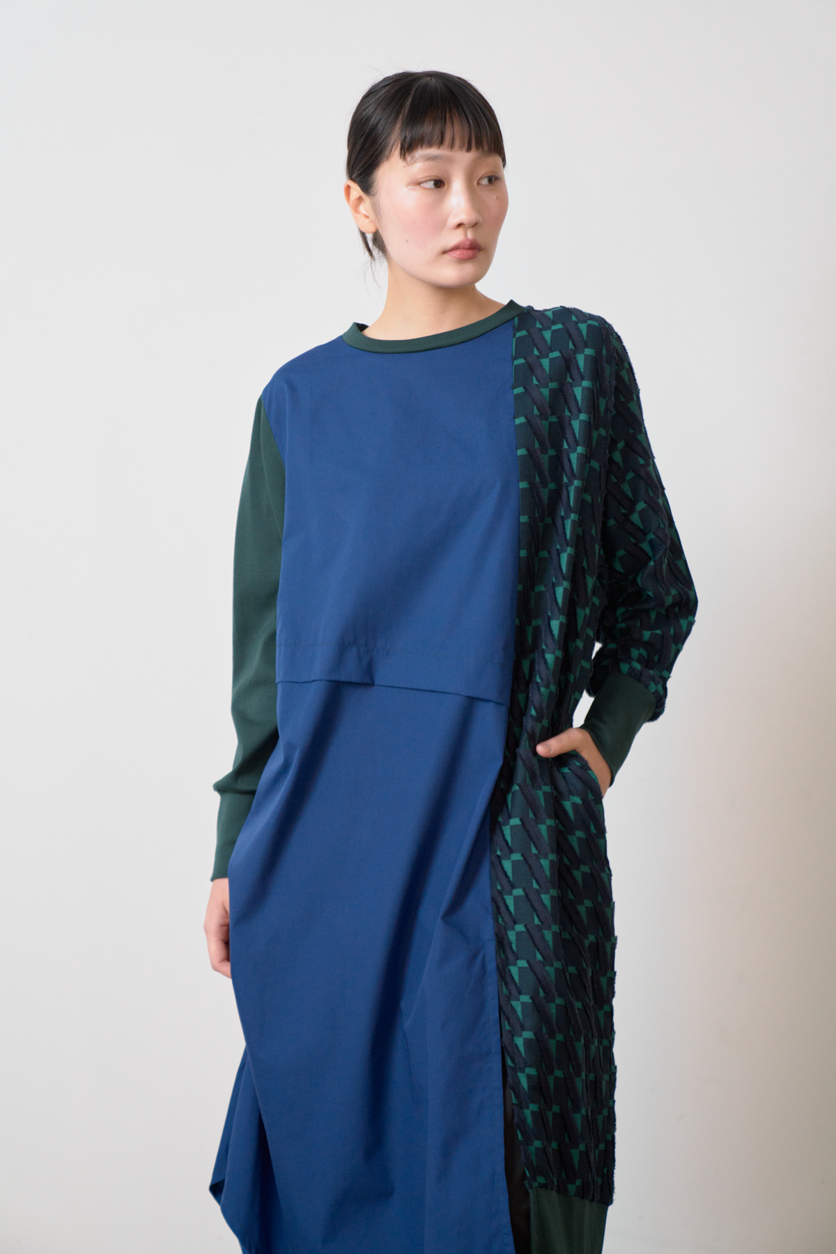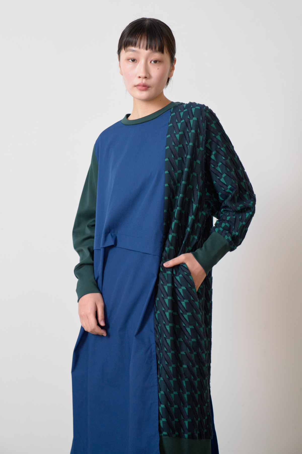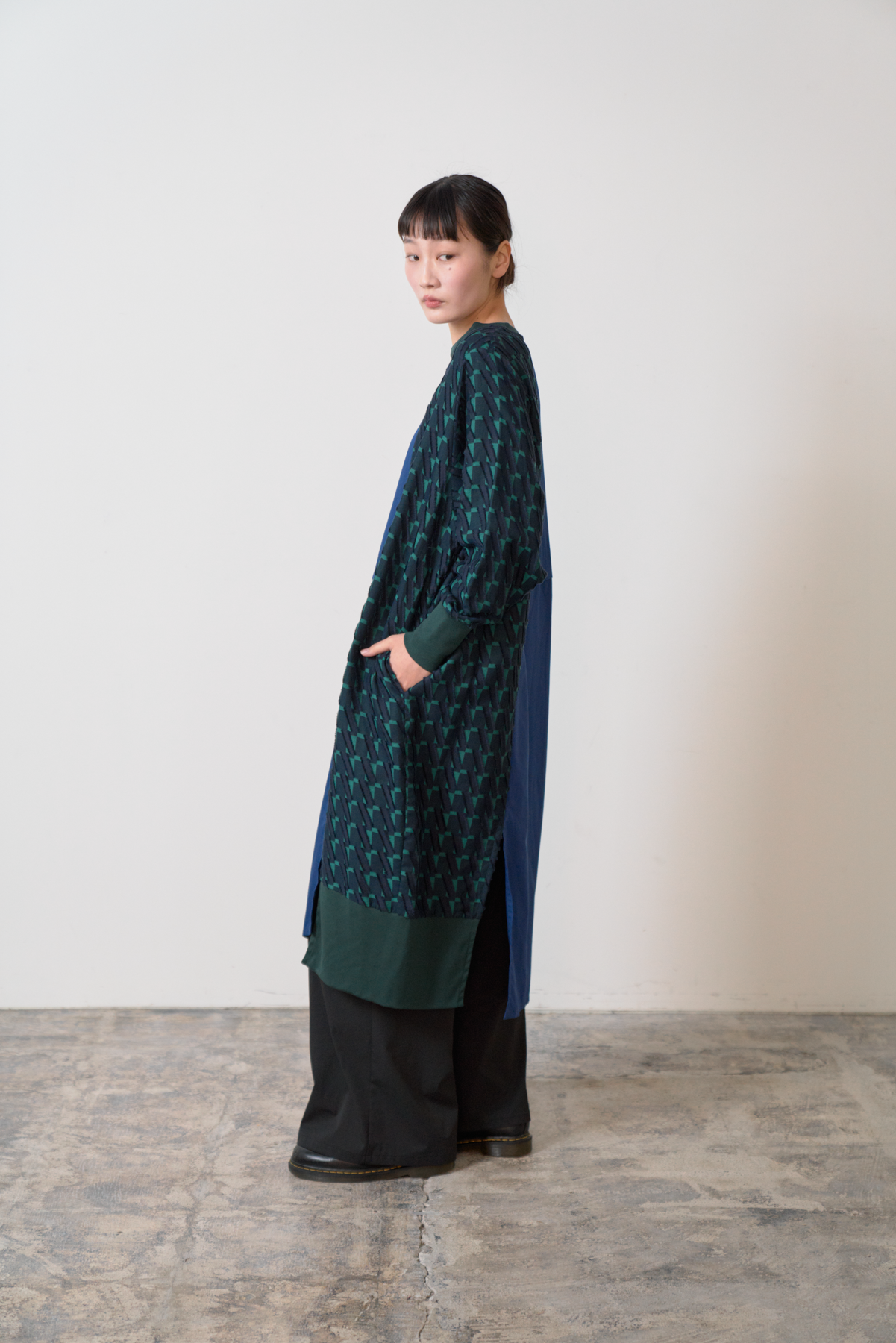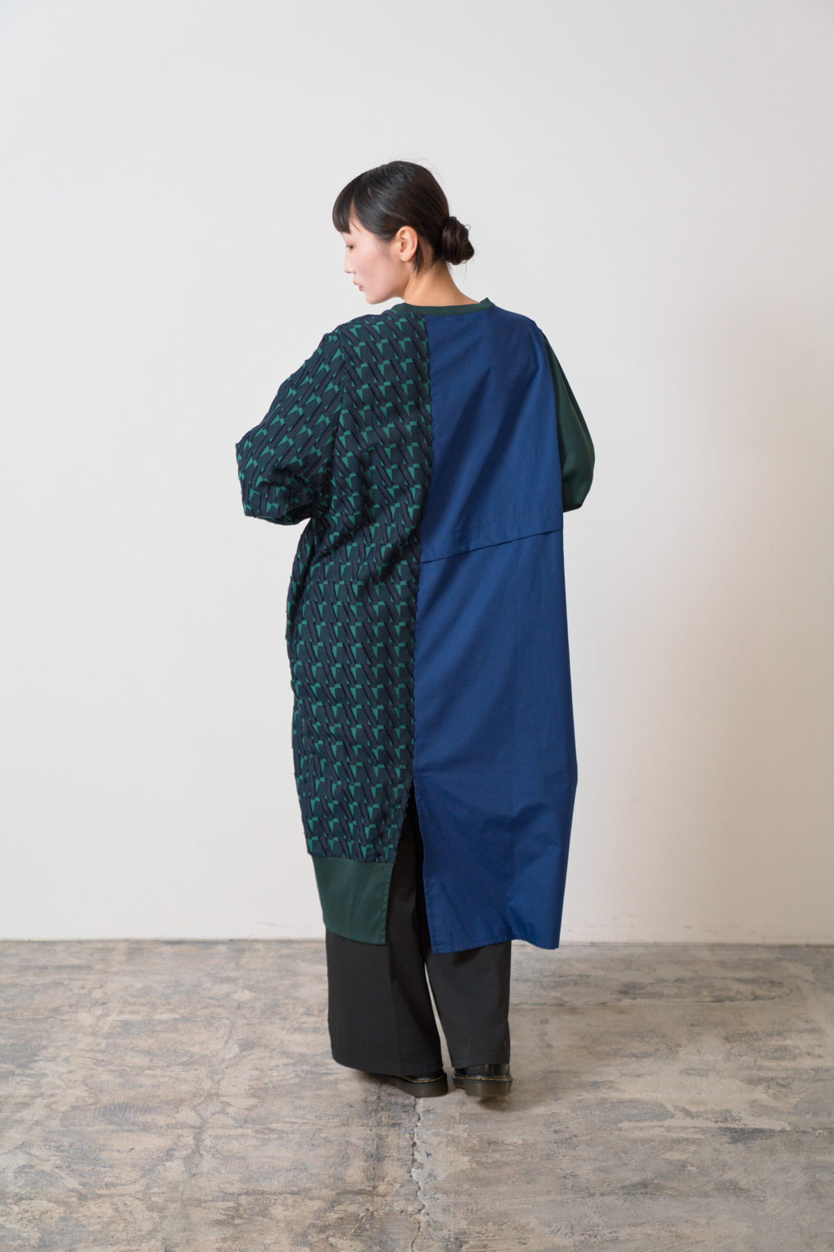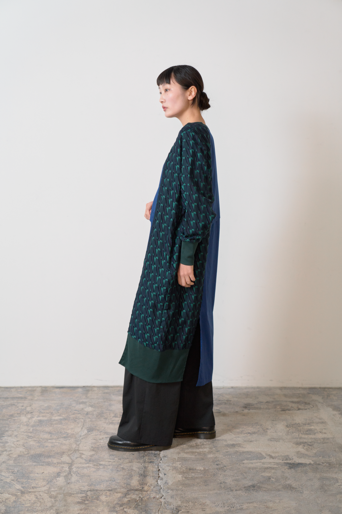 細やかなカットデザインのジャカード生地をあしらい、絞りパーツや裾にスリットを入れることによってボトムとのバランスをとりながら着こなしアレンジができるワンピースに仕立てました。左側にポケット付きでスマホなどをしまうことが可能です。
