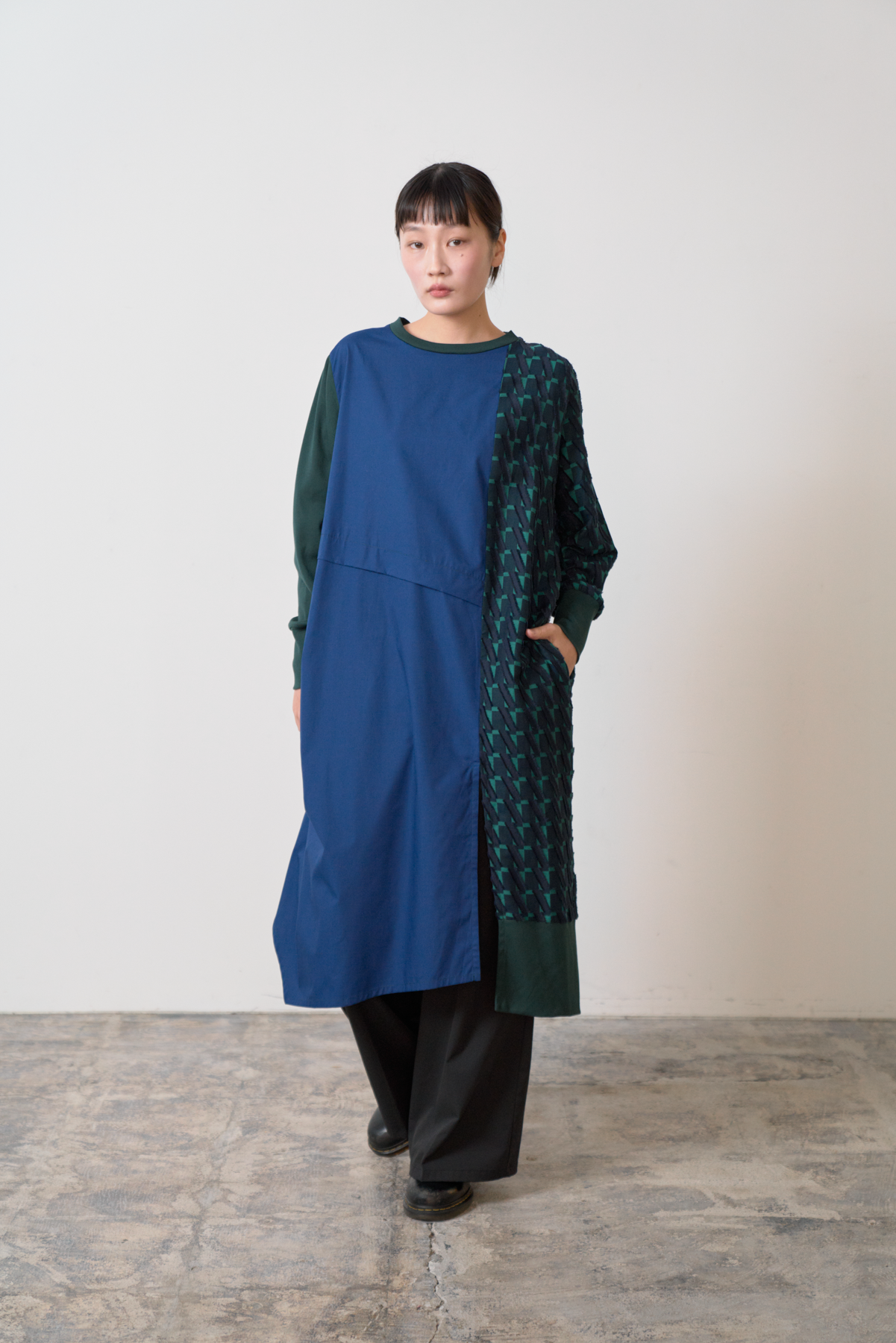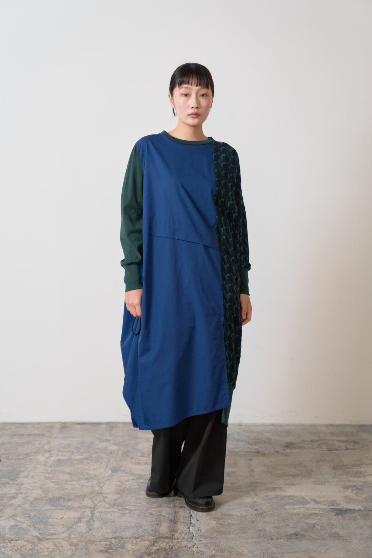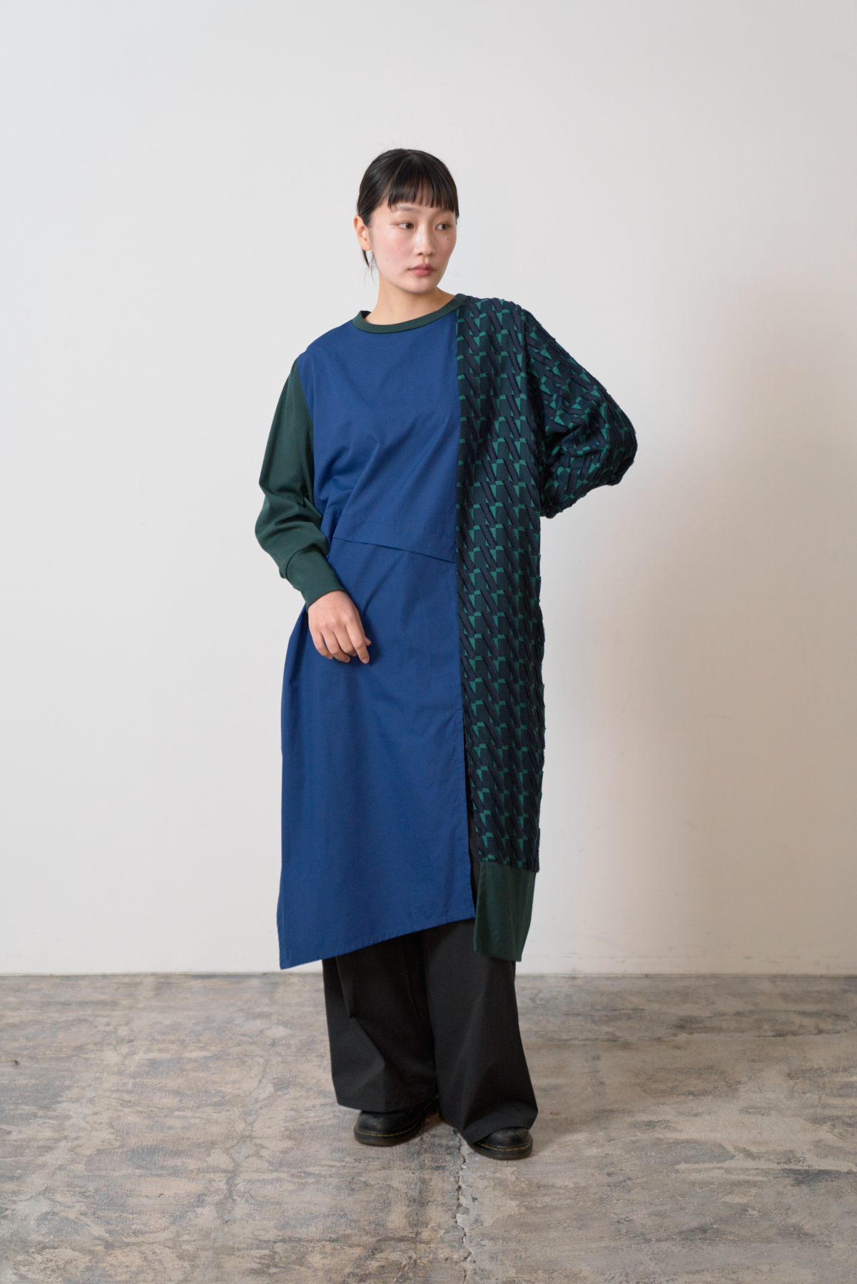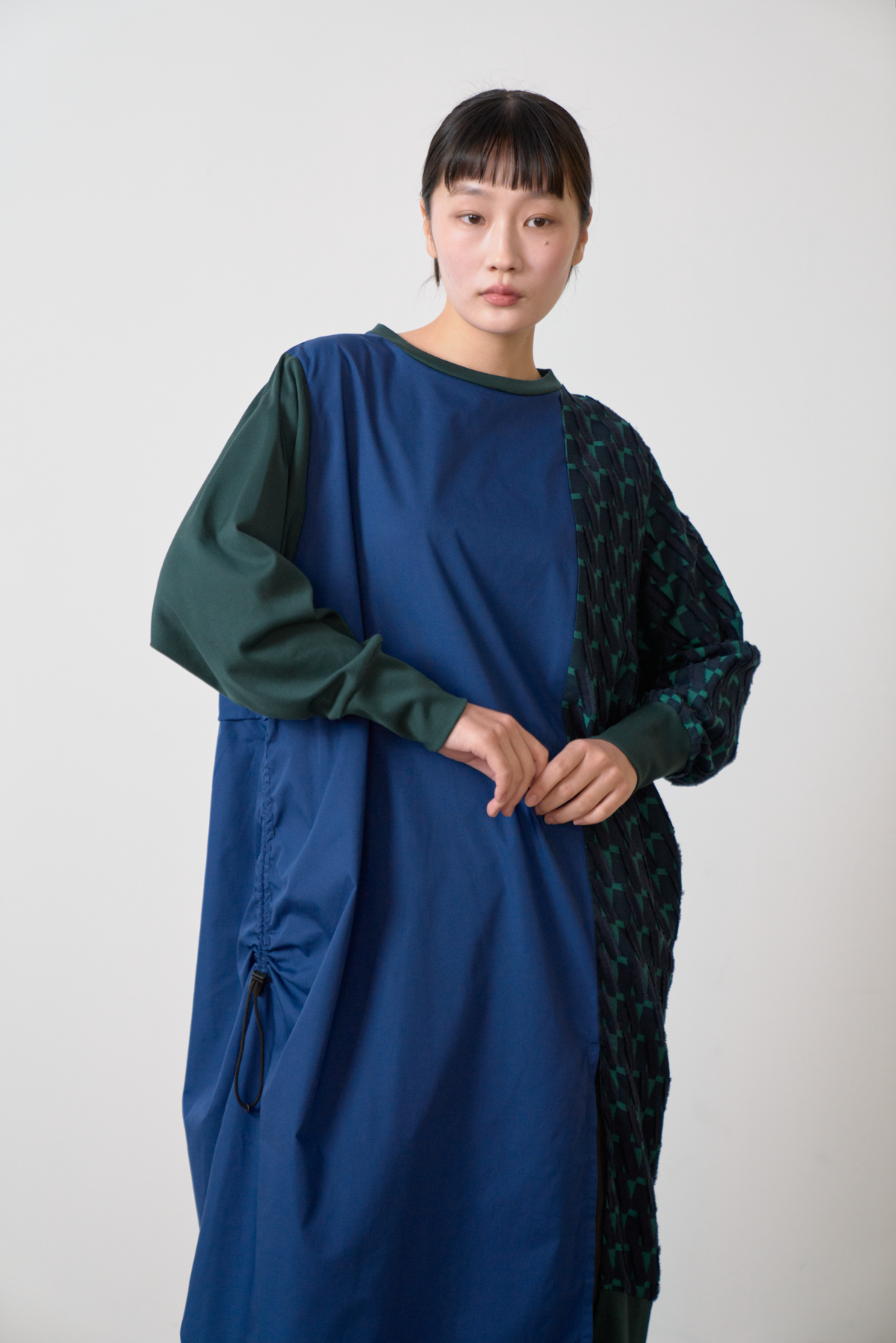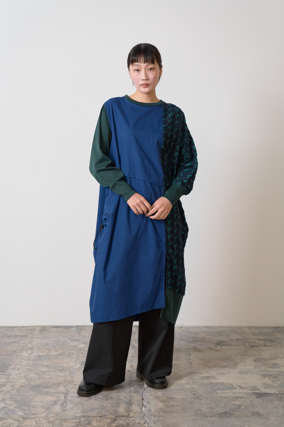 細やかなカットデザインのジャカード生地をあしらい、絞りパーツや裾にスリットを入れることによってボトムとのバランスをとりながら着こなしアレンジができるワンピースに仕立てました。左側にポケット付きでスマホなどをしまうことが可能です。