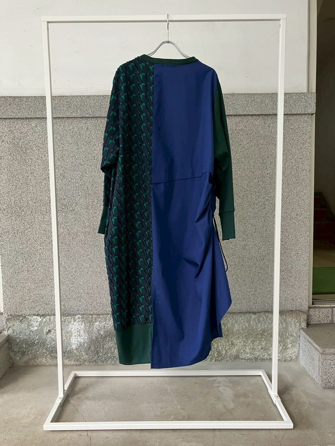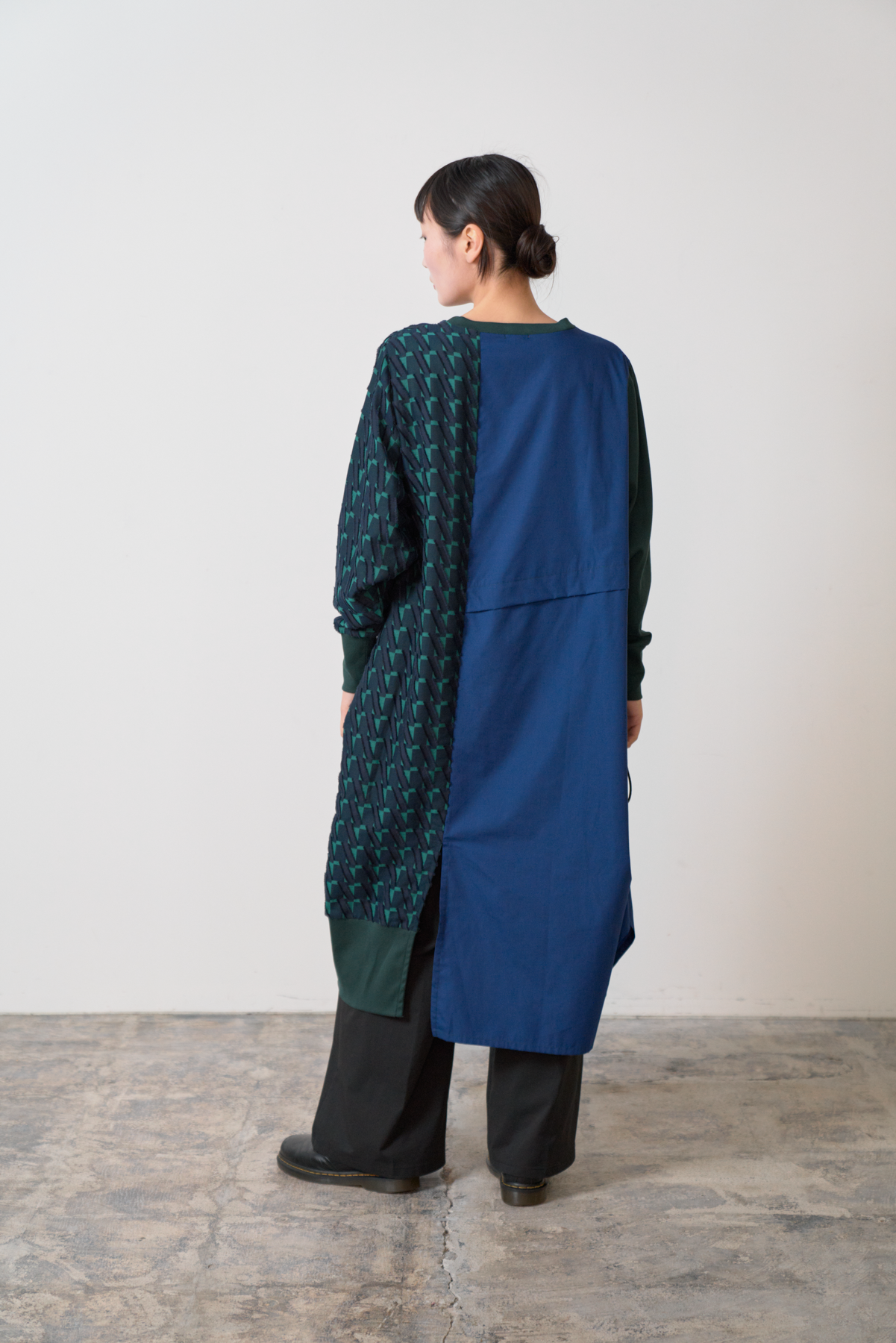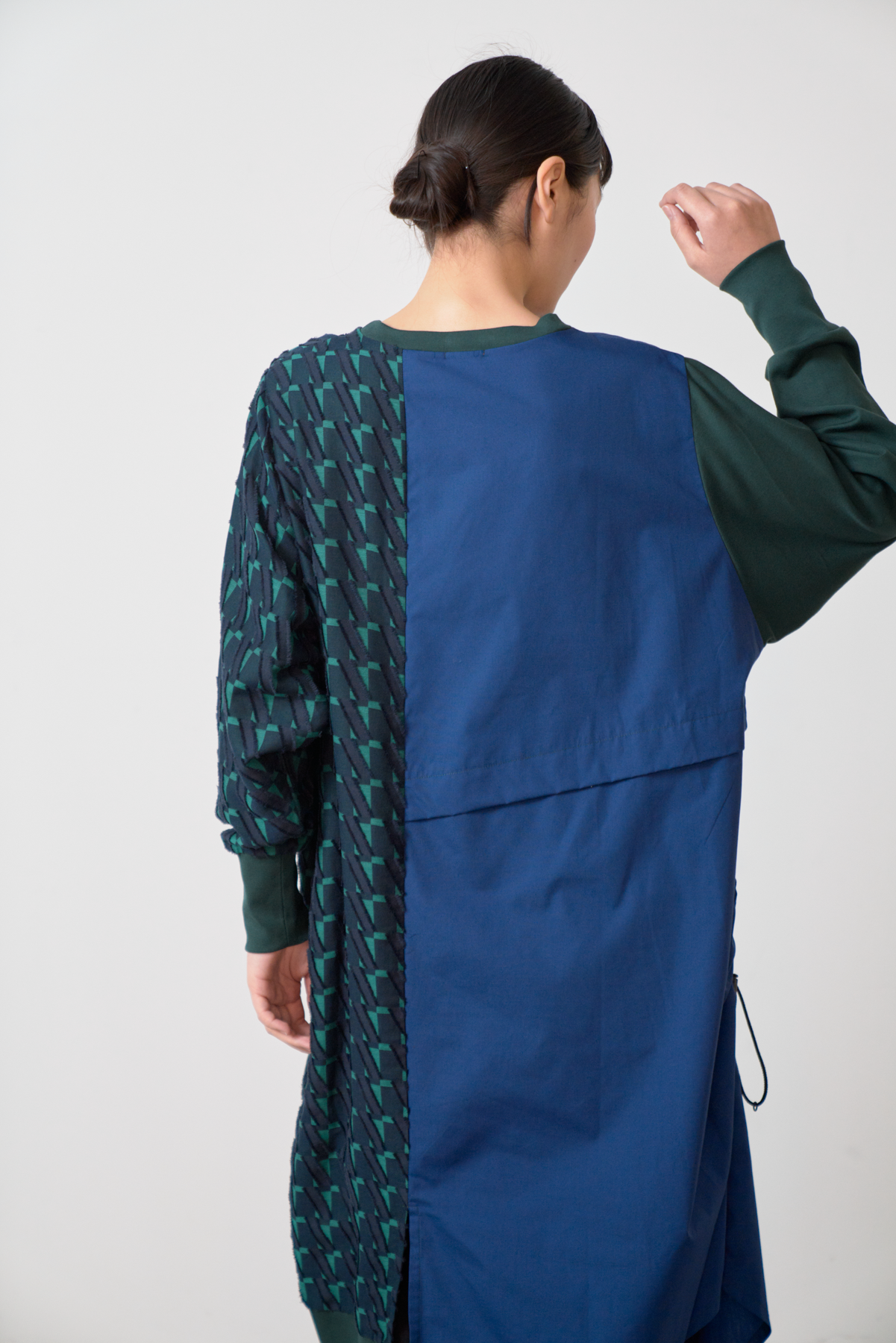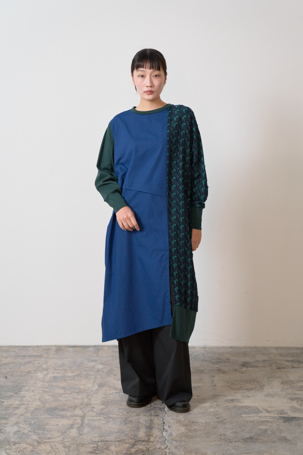 細やかなカットデザインのジャカード生地をあしらい、絞りパーツや裾にスリットを入れることによってボトムとのバランスをとりながら着こなしアレンジができるワンピースに仕立てました。左側にポケット付きでスマホなどをしまうことが可能です。