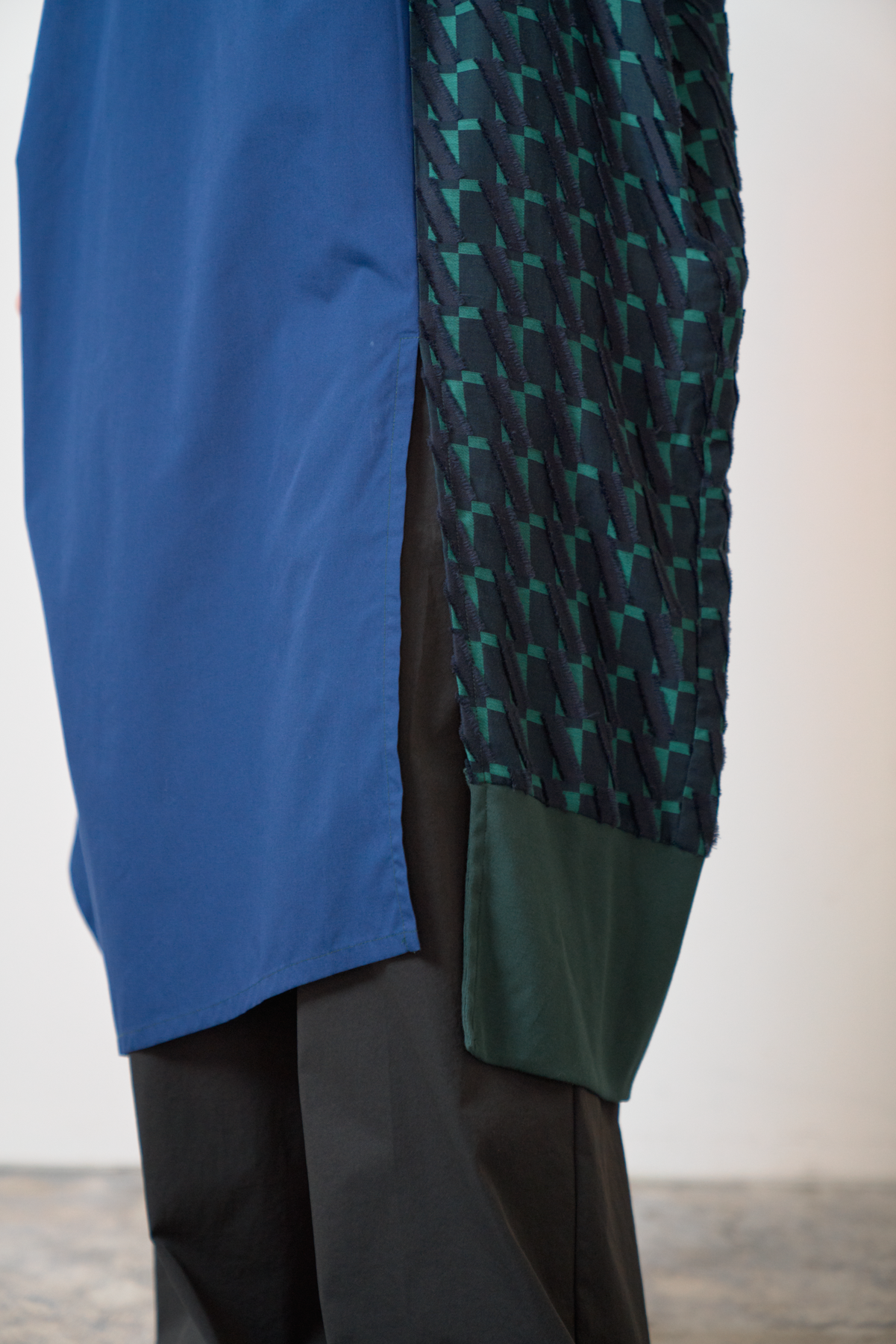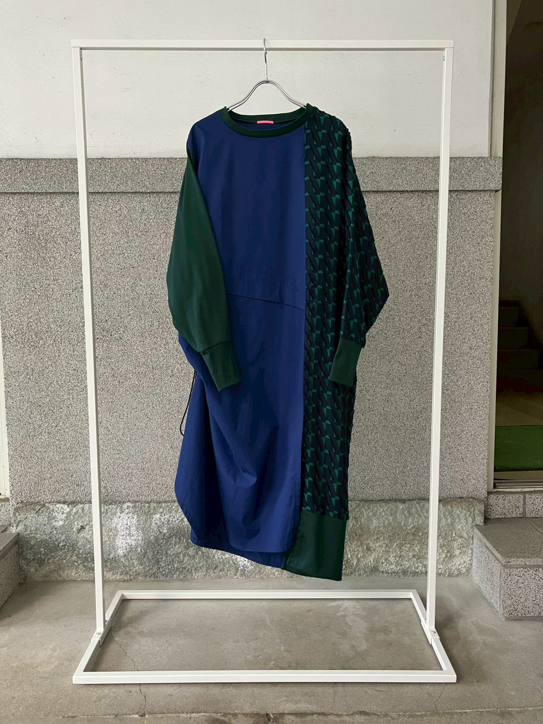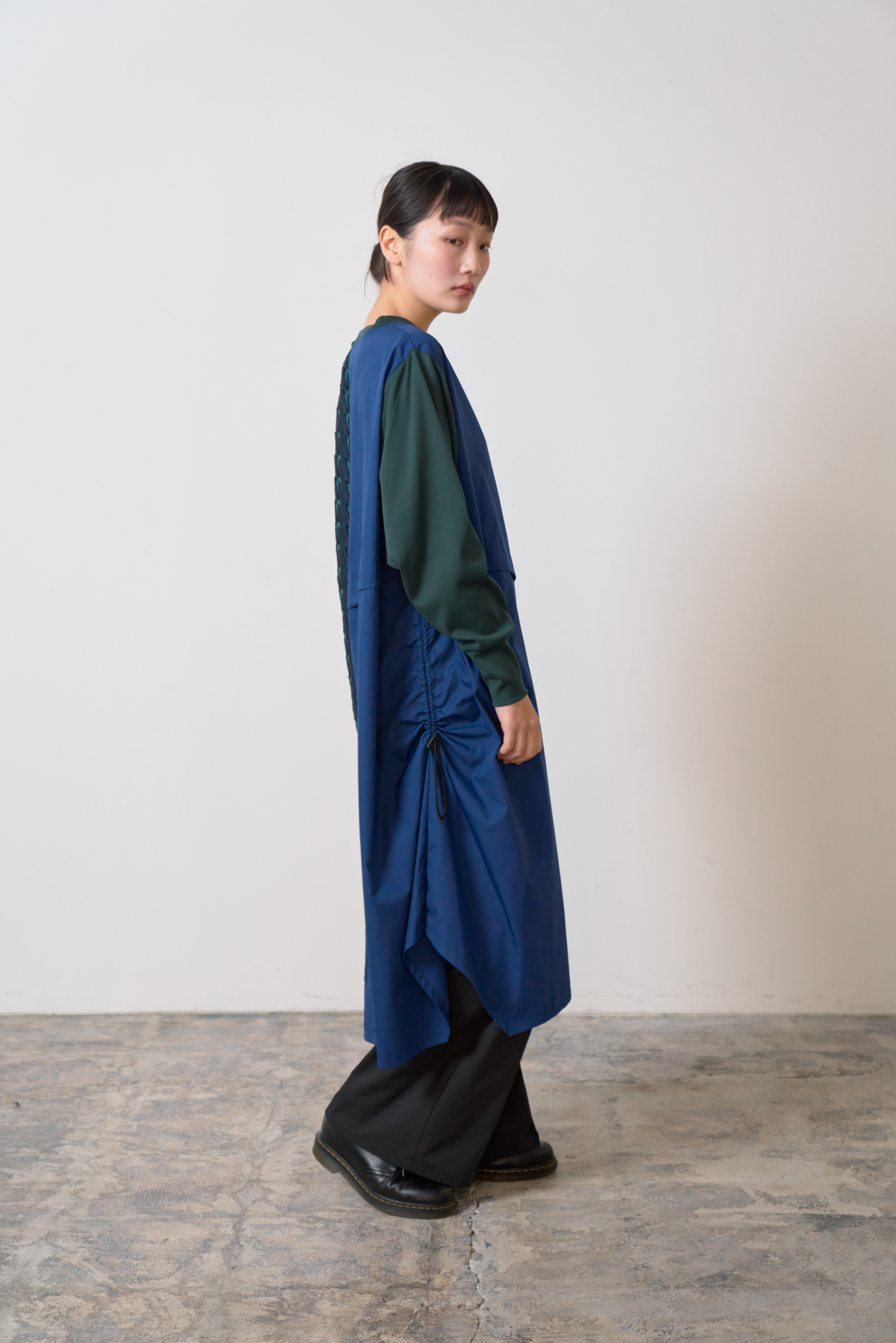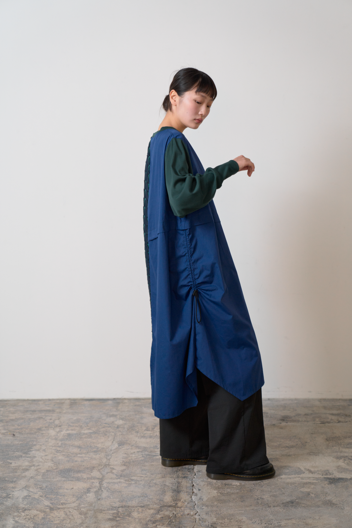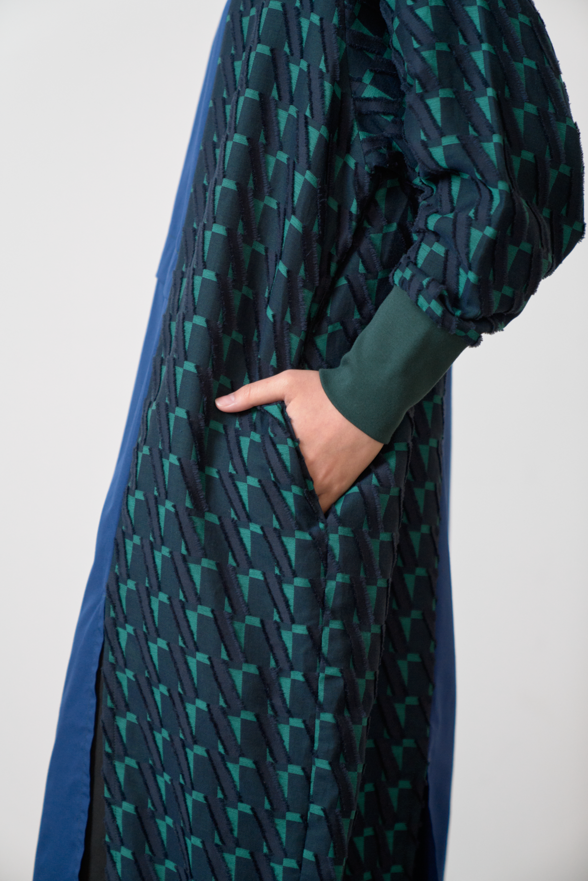 細やかなカットデザインのジャカード生地をあしらい、絞りパーツや裾にスリットを入れることによってボトムとのバランスをとりながら着こなしアレンジができるワンピースに仕立てました。左側にポケット付きでスマホなどをしまうことが可能です。