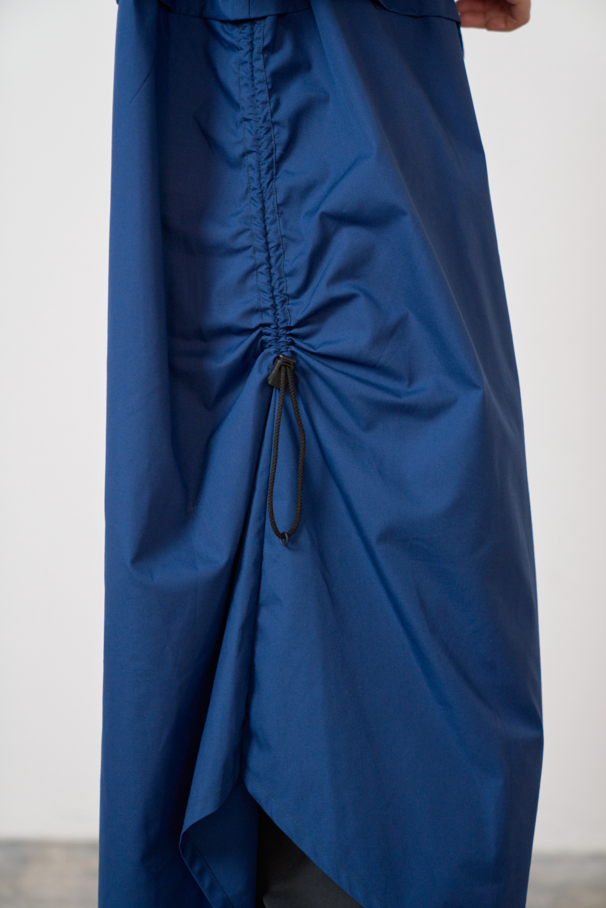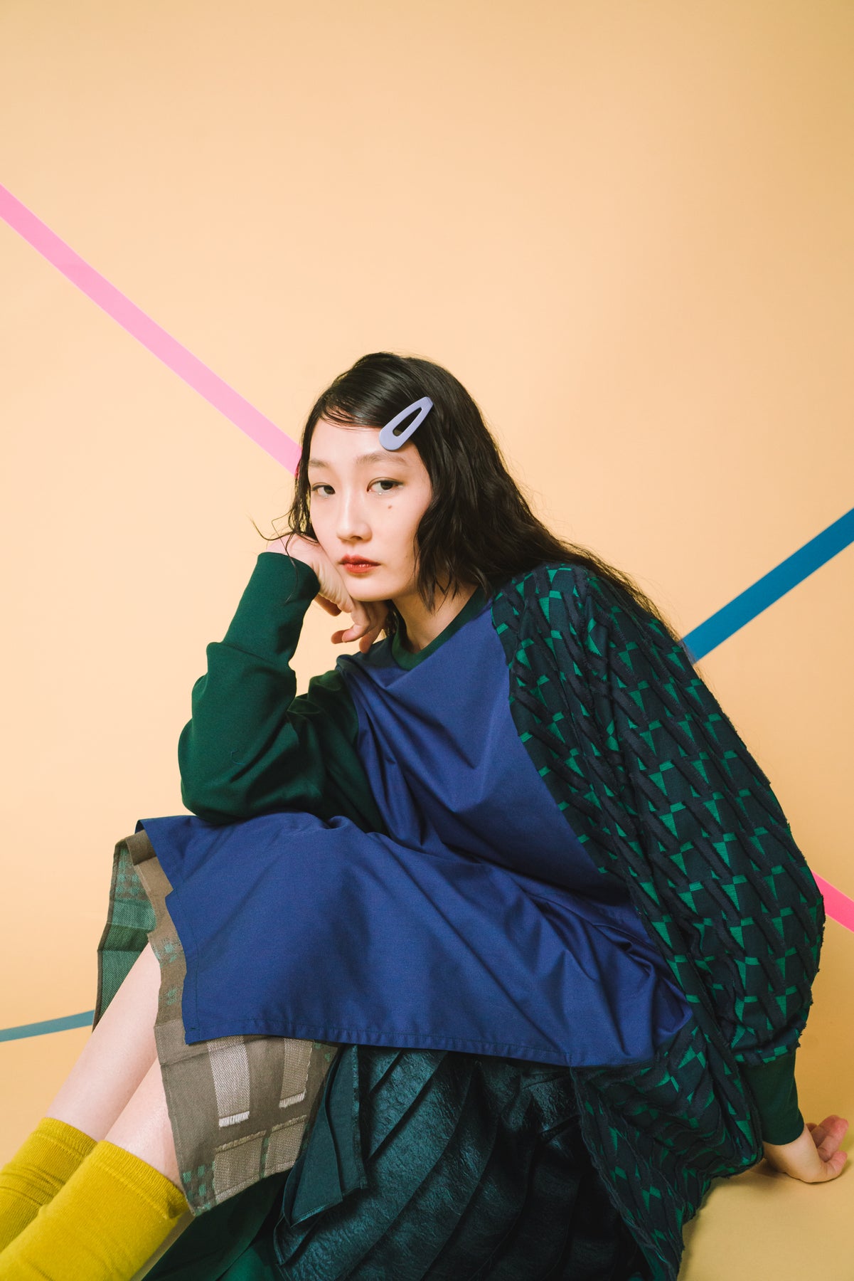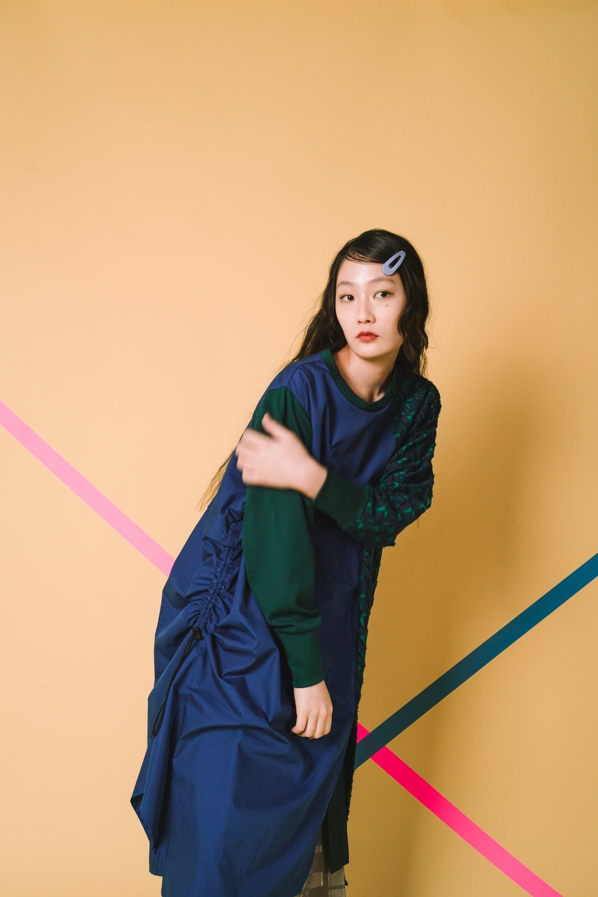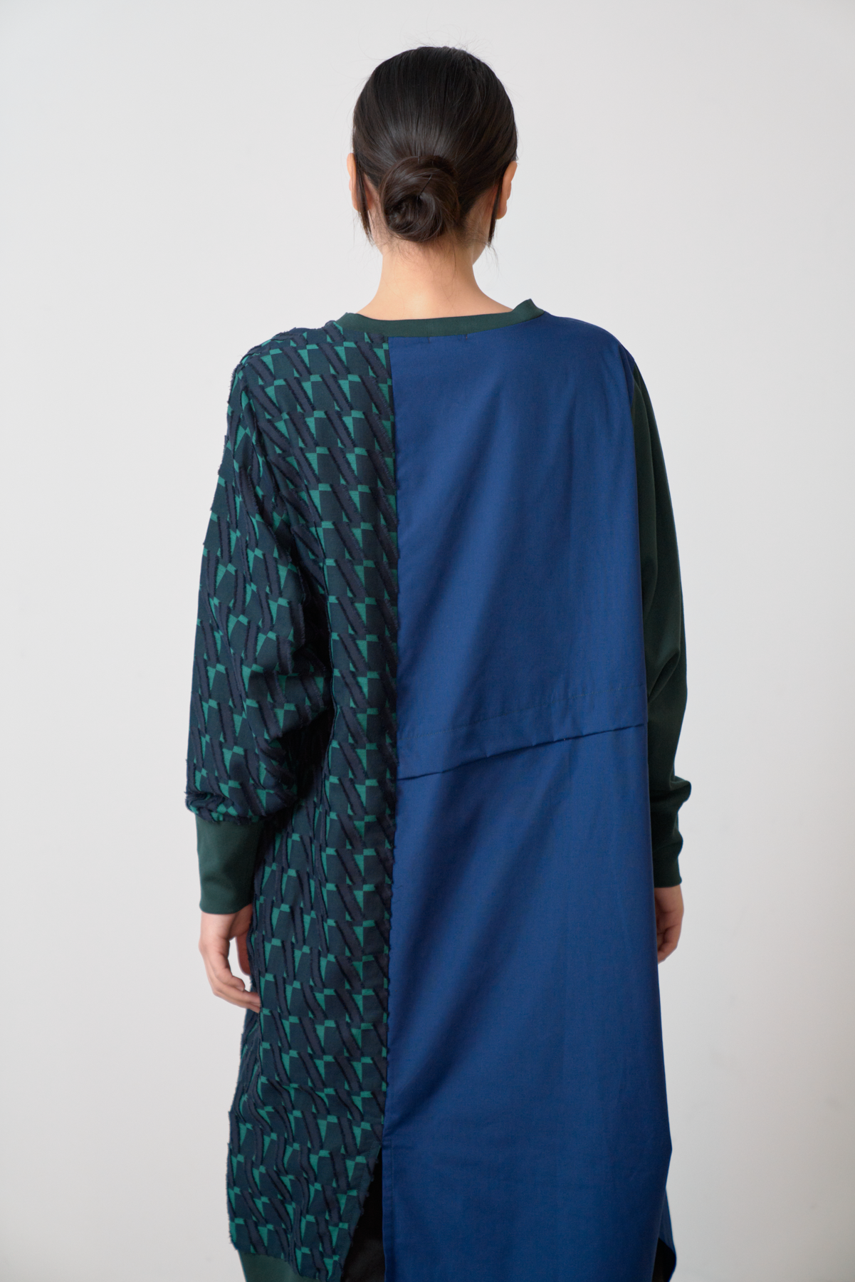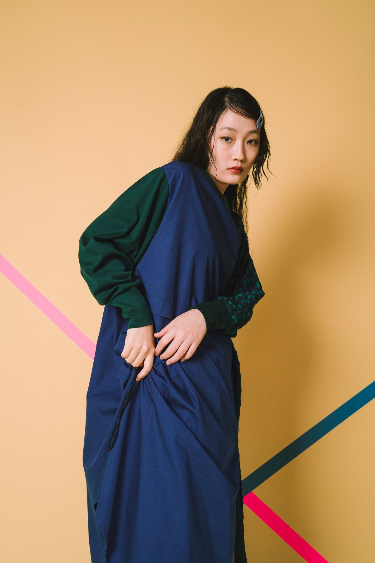 細やかなカットデザインのジャカード生地をあしらい、絞りパーツや裾にスリットを入れることによってボトムとのバランスをとりながら着こなしアレンジができるワンピースに仕立てました。左側にポケット付きでスマホなどをしまうことが可能です。